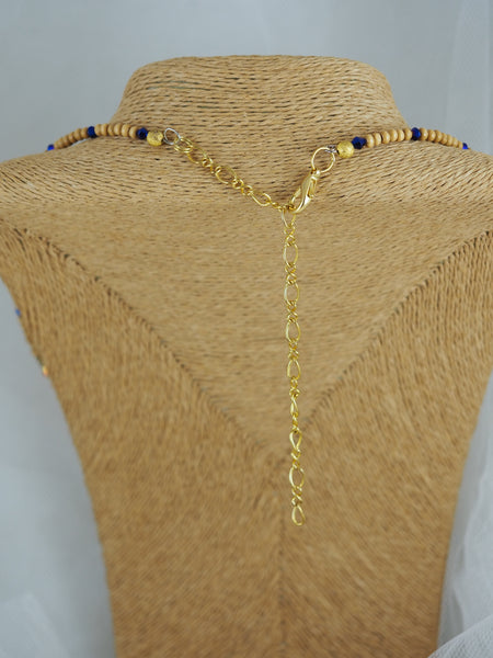 Neck accessory designed for women. This piece of jewelry is designed using a firm collar decorated with crystals, beads, and other various elements. The main elements of an accessory are brass and oval-shaped wooden plates.