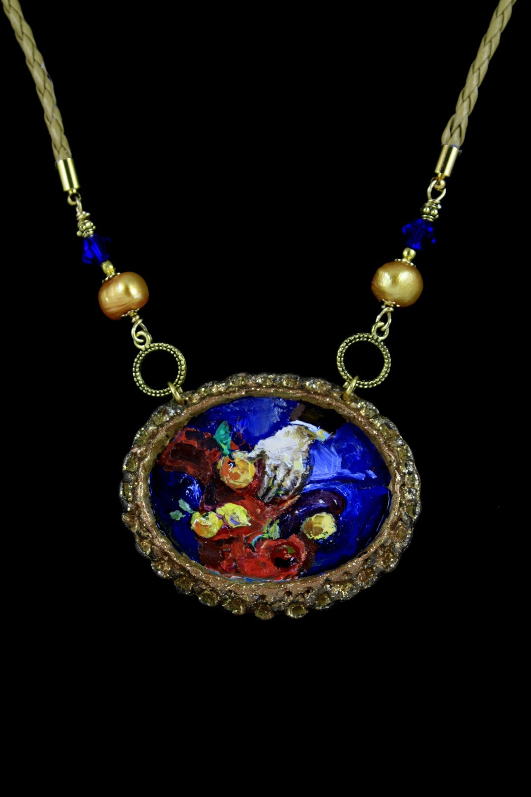 Oil painting, model base, pearls, crystal, natural leather, gold color metal.