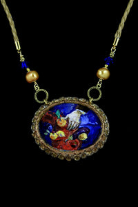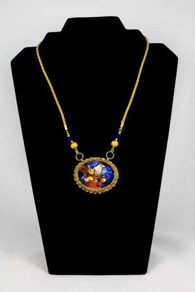 The brass base of the accessory is decorated with classic oil paintings. The necklace uses
