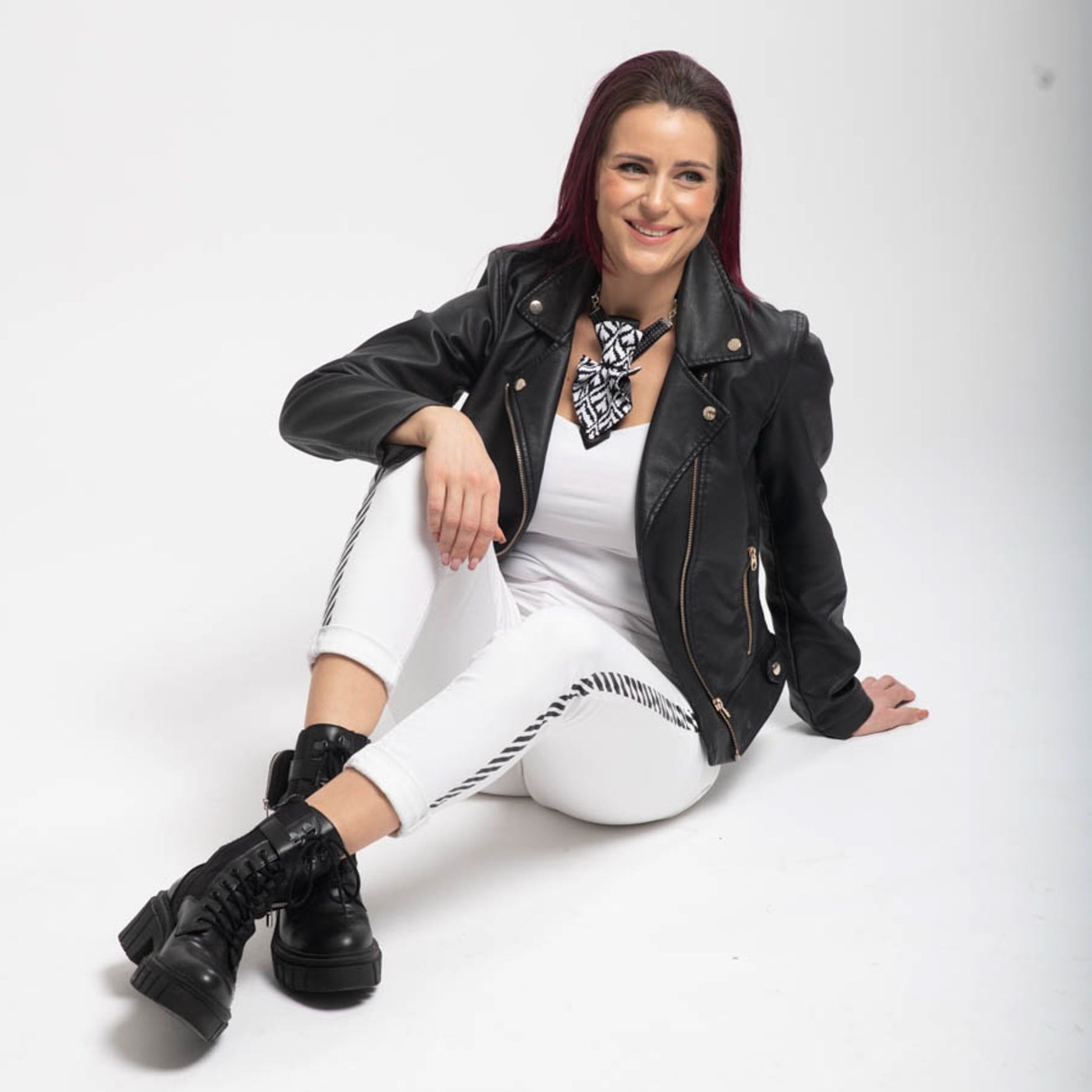 Jabot -Hopper tie "Zigzag" is a special model of women's Ruty Design ties, reminiscent of the pleated collar decor pieces of the 18th century. Classic ornament of geometric figures, framed by black elements. A combination of zigzags and playful dots is combined in the double-sided jabot. The classic, always relevant, combination of black and white looks new again in the original, wavy shapes of the tie.
