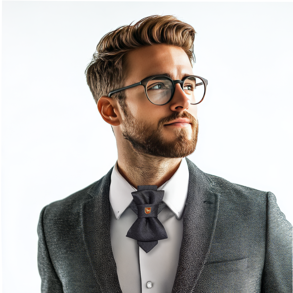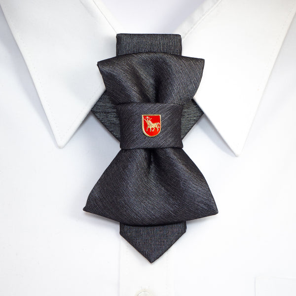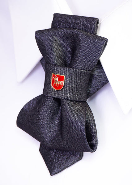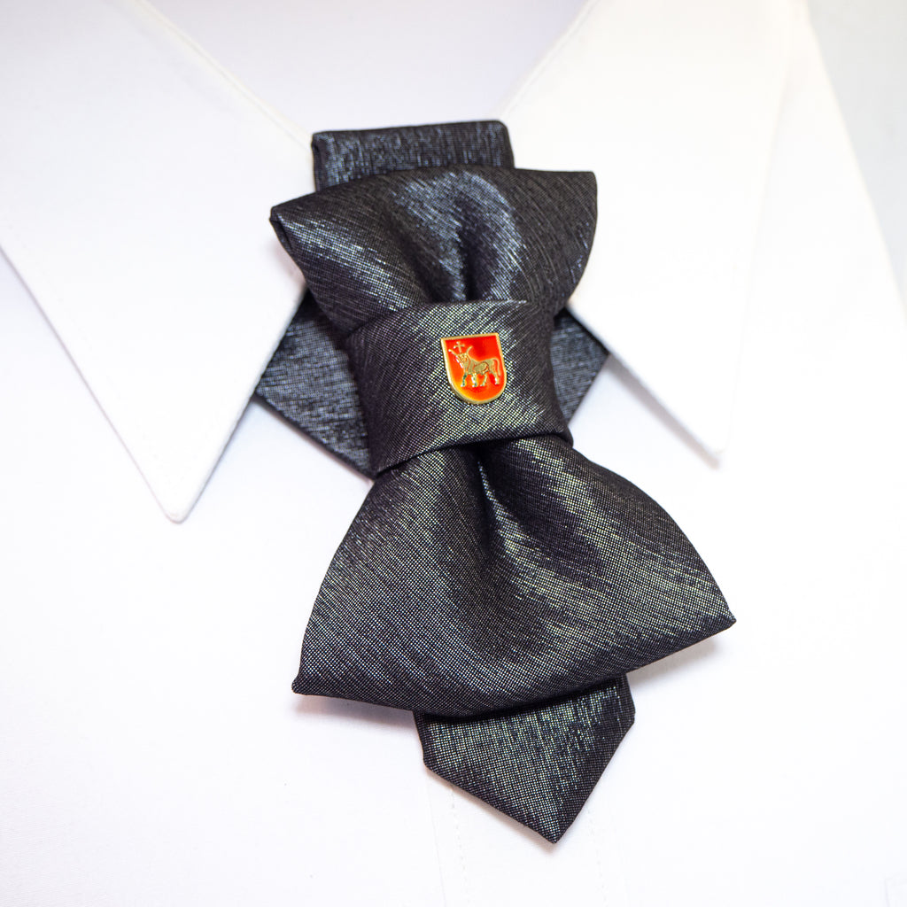 The Bow tie available on the e-shop is an elegant and understated accessory with a steel-colored base. It is accented with a striking brass badge in red enamel that adds a pop of color and visual interest. The badge features a Taurus with a golden cross between the horns, which is a powerful symbol of strength and honor. This bow tie is perfect for formal occasions or to add a touch of sophistication to any outfit.