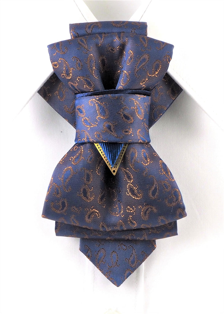 HOPPER TIE “Mist” is a subtle, elegant, and luxurious piece of accessory. A puffy construction creates an image of brave elegance. A navy tone of shiny texture enlights a soft golden pattern. The tiny detail of a triangle at the center of the accessory gives a subtle hint of modern classics. This accessory will match perfectly with tailcoats, tuxedos, and smart suits.