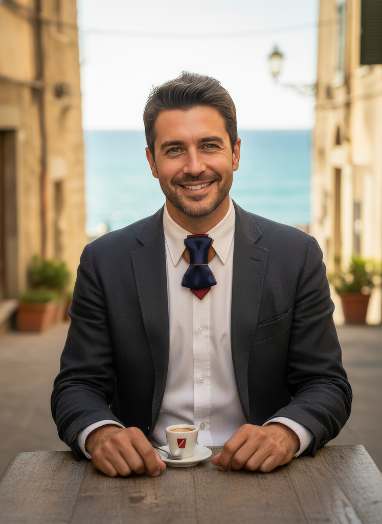 The deep harmony of midnight blue, red-wine burgundy, and antique gold creates a timeless palette long celebrated in classic men’s ties and bow ties. In TRIO, these three colors highlight the accessory’s architectural, sculpted body, giving it a bold yet refined character.