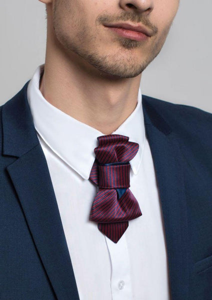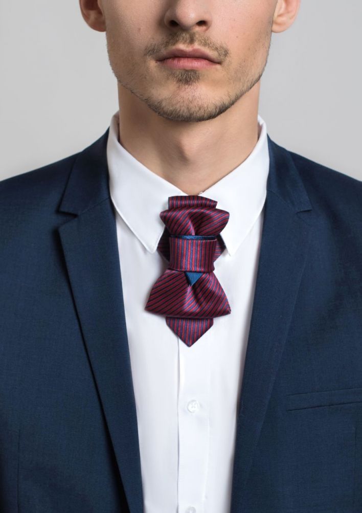 Is both a brave and classic accessory for men. The striped pattern is a great reflection of the classics. A navy triangle at the center of the accessory gives a subtle hint of the trend while shiny material attracts all attention to details.