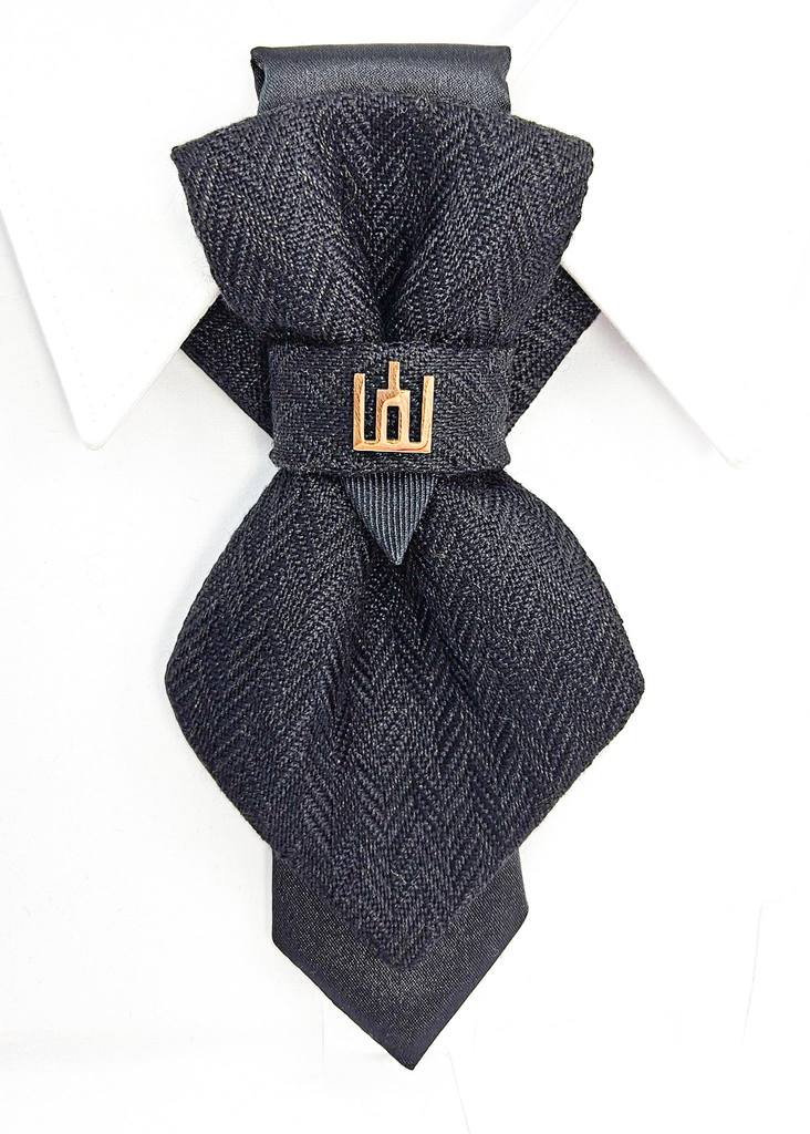A black, uniquely designed tie-Hopper tie radiates subtle luxury and patriotic elegance. Its deep black color and textured fabric convey classic sophistication, while minimalist lines highlight a modern aesthetic. The focal point of the tie is a gilded Gediminas Columns emblem. Tastefully integrated, it catches the eye with its golden reflections and symbolizes Lithuanian identity, honor, and history. The shimmering accent against the matte fabric background lends the accessory a sense of formality and distinction.
