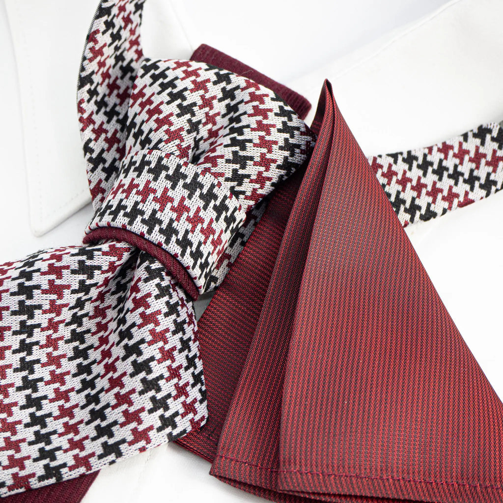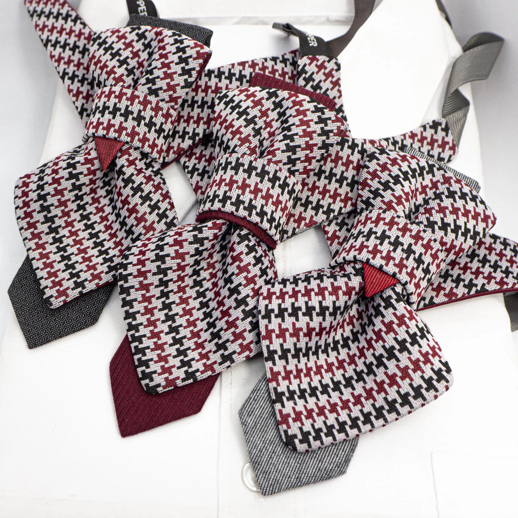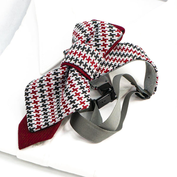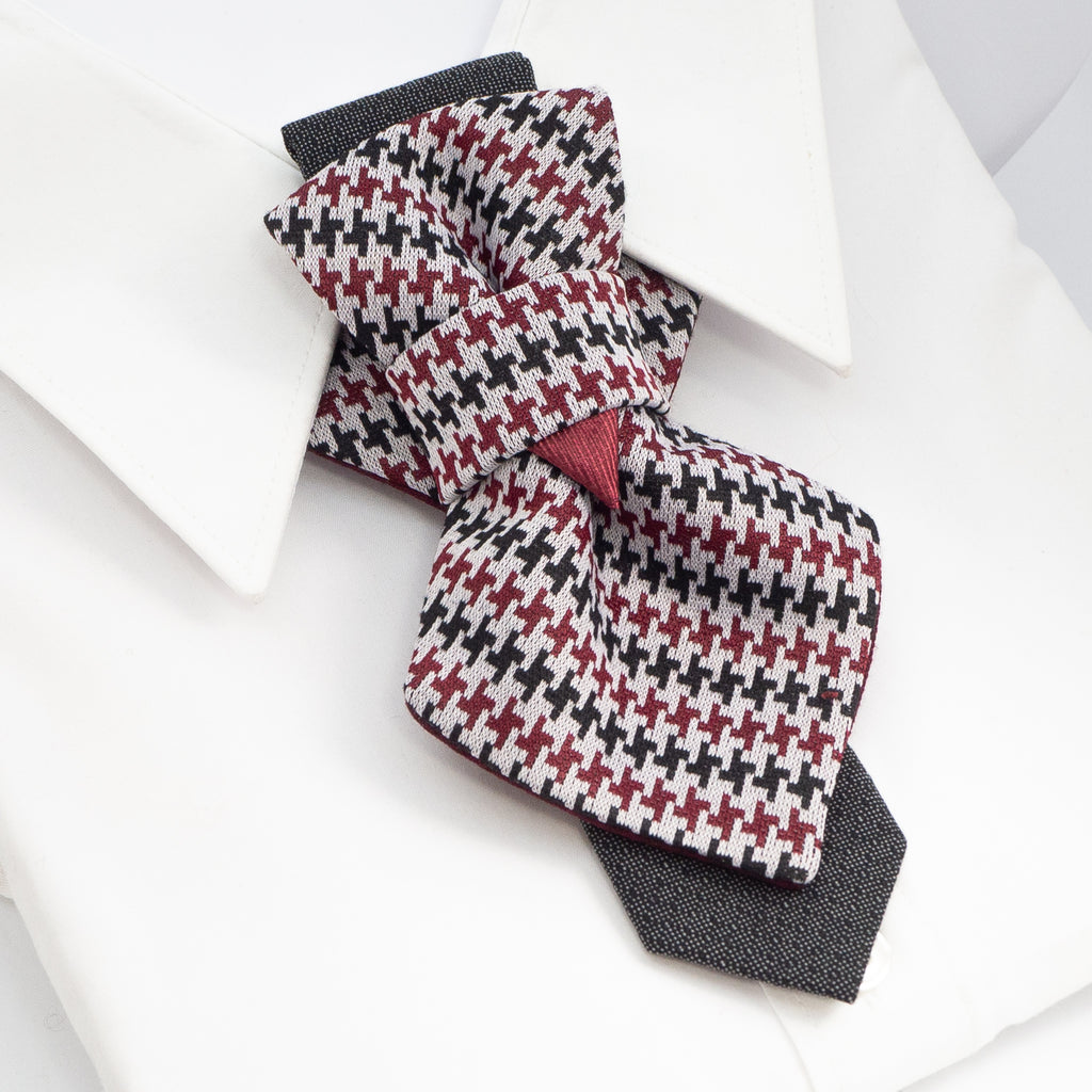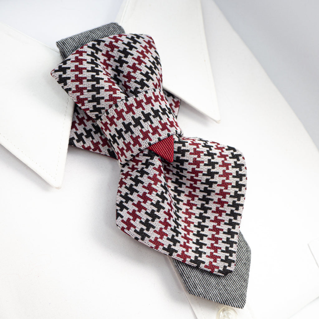 handmade luxury unisex necktie, vertical bow tie, houndstooth pattern, red black white tie, artistic necktie, wedding accessory, groom gift, musician style, luxury tie, unique neckwear, statement tie, formal fashion, sculptural tie, designer bow tie