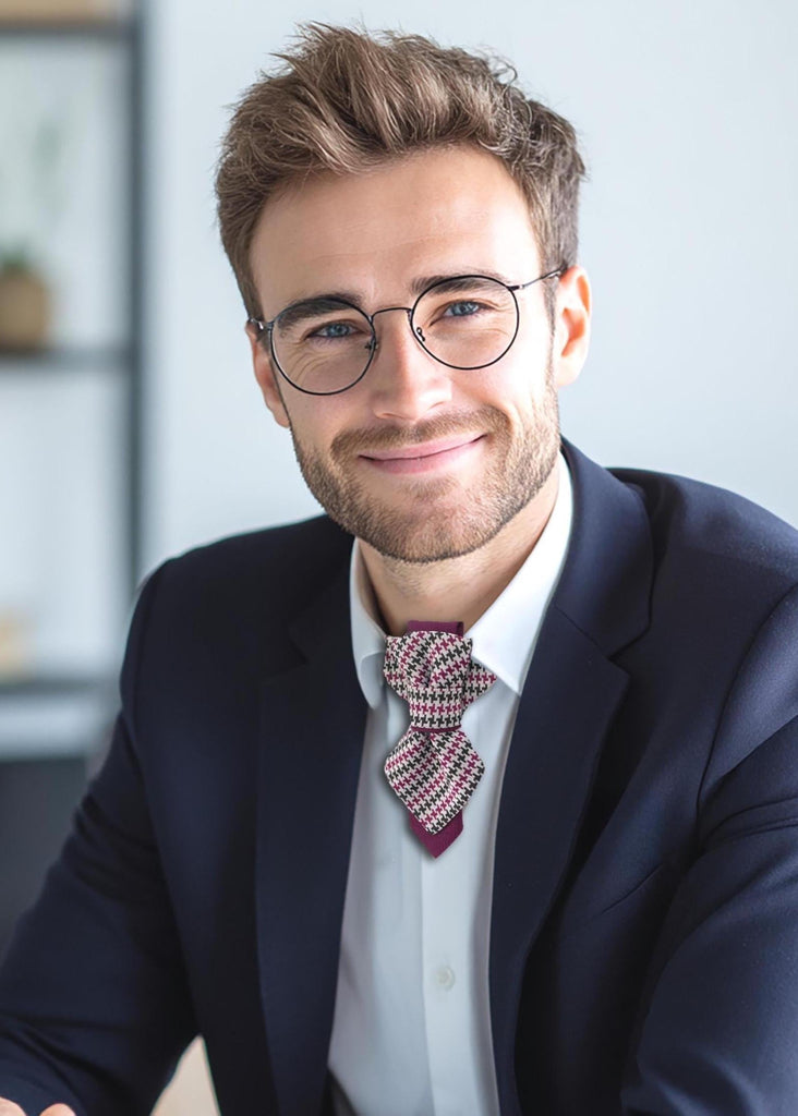 Stand out with this handmade luxury vertical bow tie, crafted for those who appreciate originality and refined elegance. This unique necktie features a striking houndstooth pattern in deep rust, black, and white tones, creating a timeless yet bold statement. The vertical bow design seamlessly blends the classic lines of a tie with the artistic flair of a bow tie, making it perfect for weddings, concerts, galas, or stylish everyday wear.