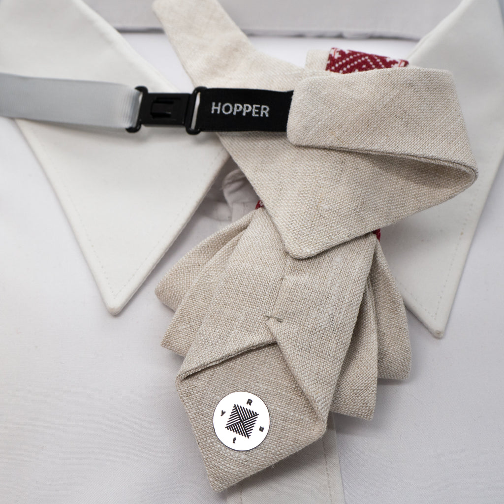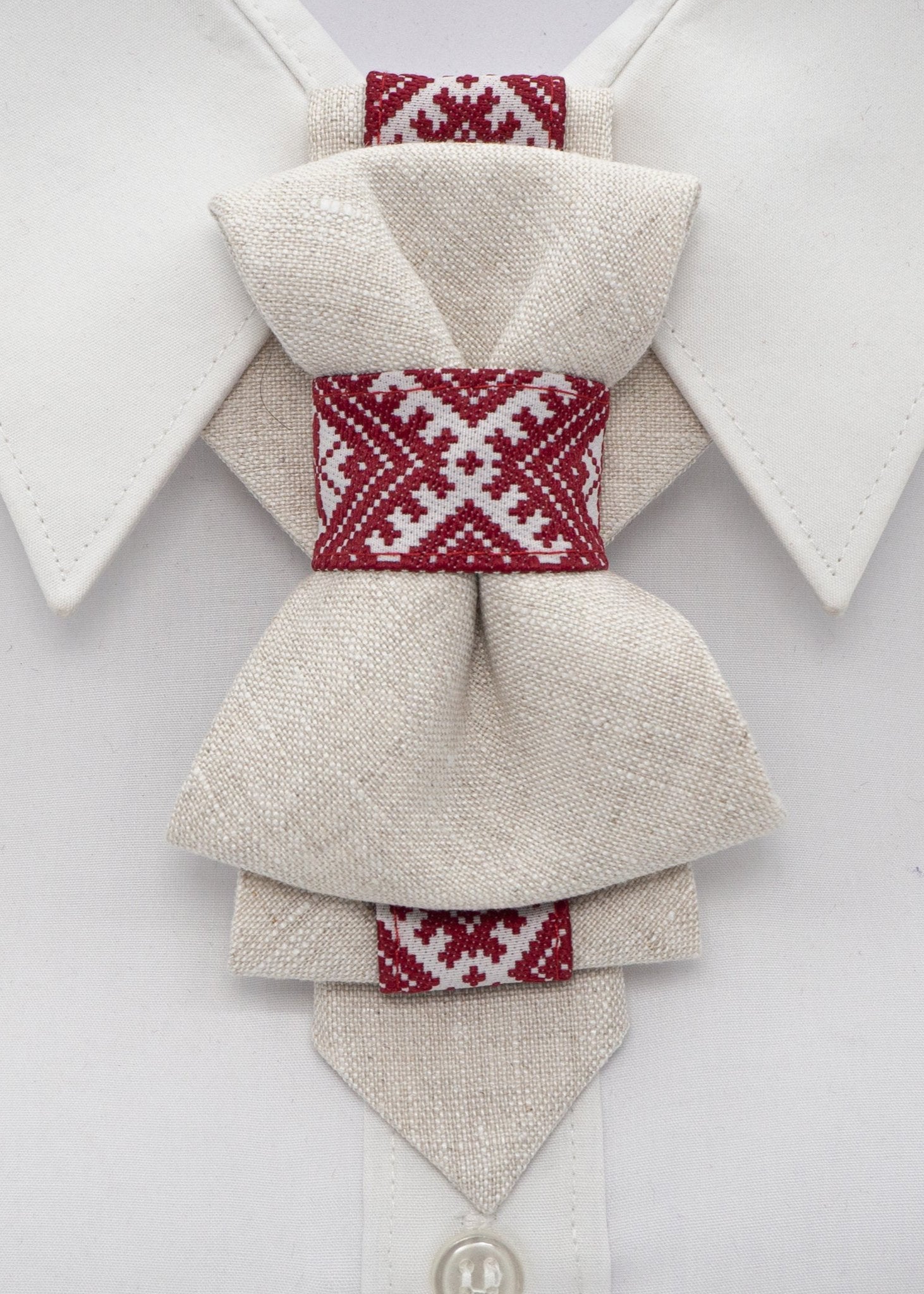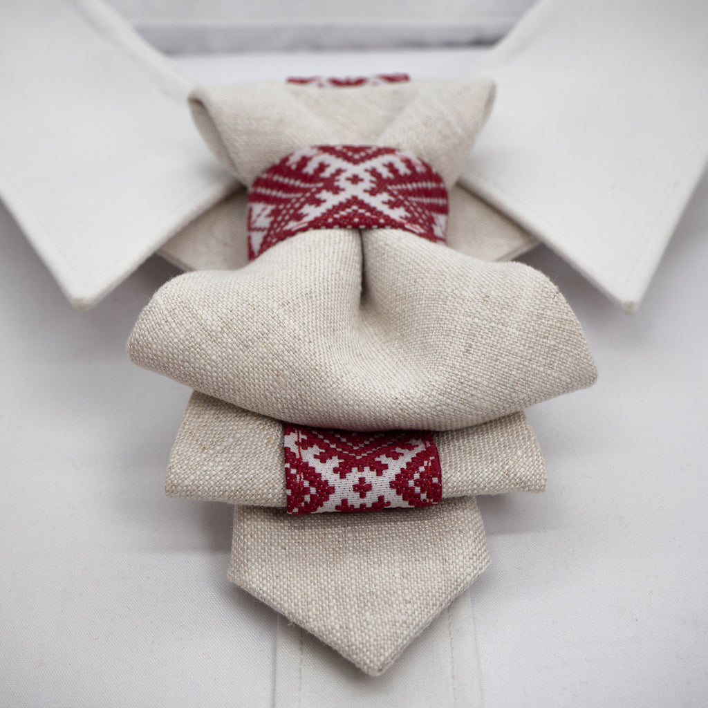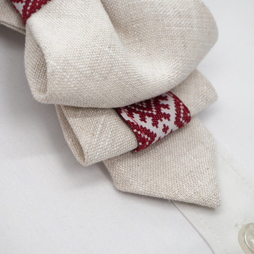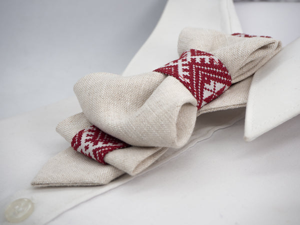 A beige linen vertical bow tie with red ethnic motifs, displayed on a white shirt collar.