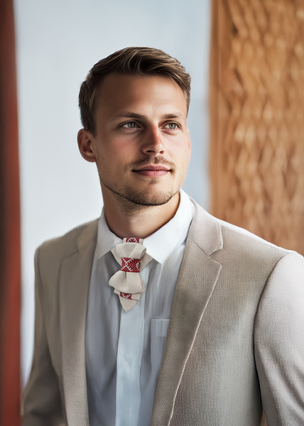 The neutral and earthy tones of linen pair beautifully with suits in navy blue, charcoal gray, or classic black for a timeless look. For a more relaxed vibe, combine it with lighter shades like beige, tan, or soft pastels to complement the bow tie’s ethnic charm.