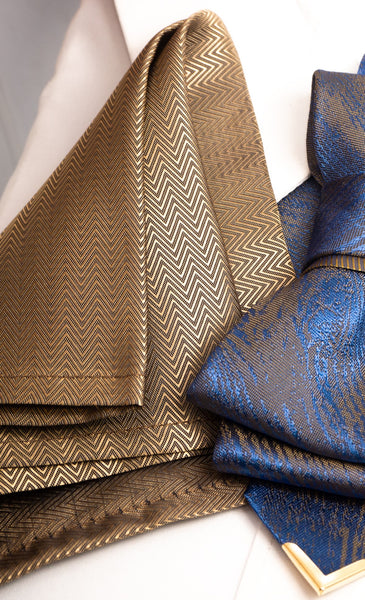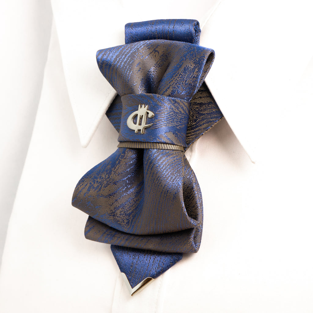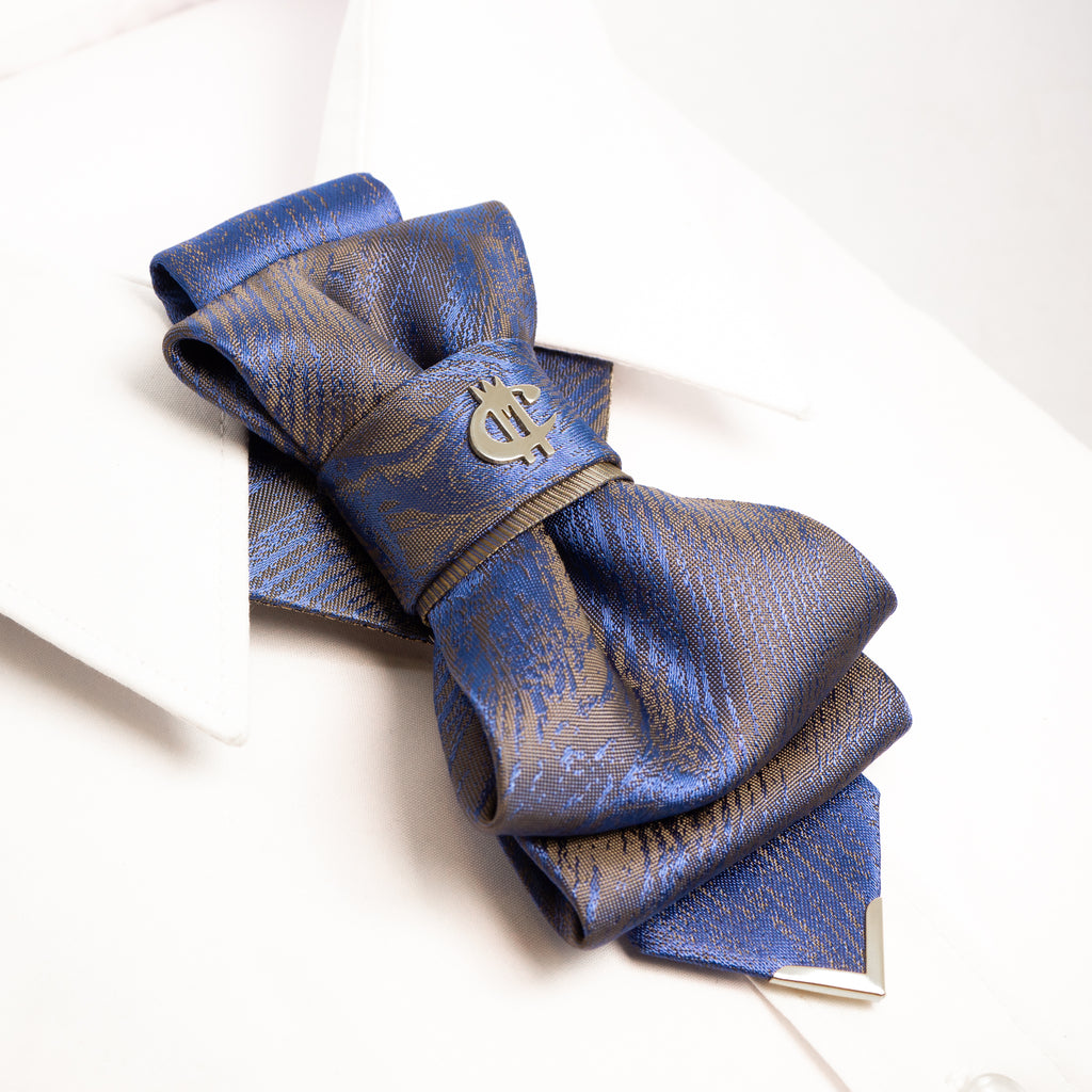 Brass initials - exclusive element of the tie. The soft satin fabric, in which blue and yellowish/sandy tones intertwine, goes well with it. Wear the piece with a white or champagne-coloured shirt. The chameleon colour combination is easily matched to a variety of base suit colors.