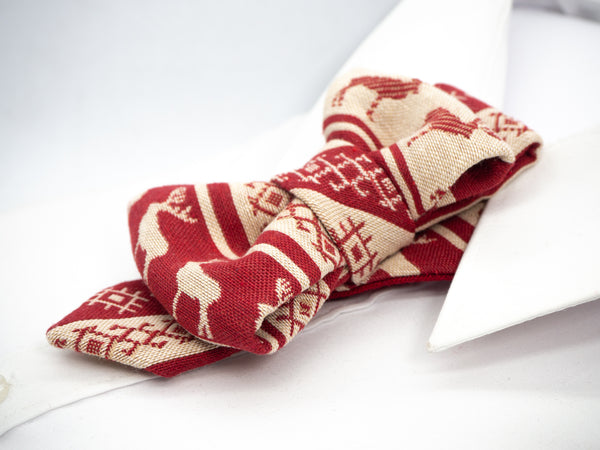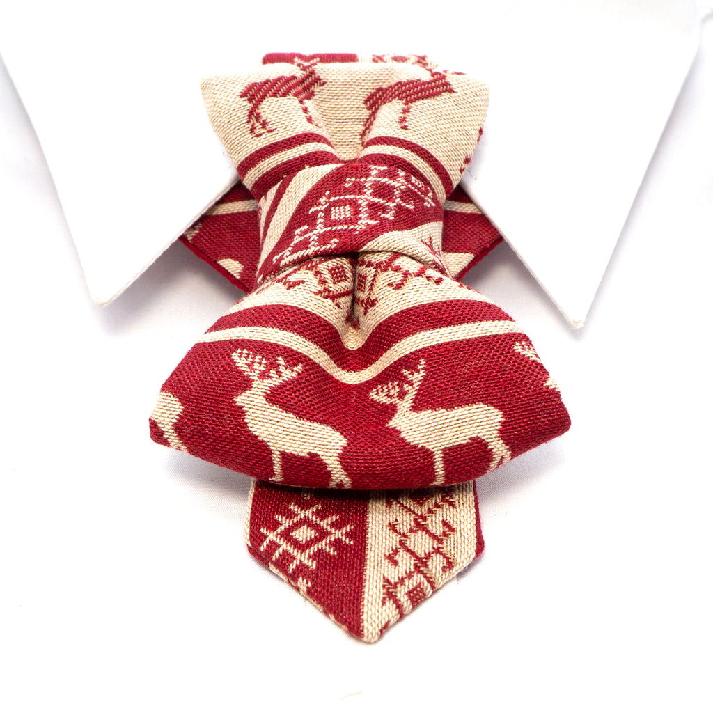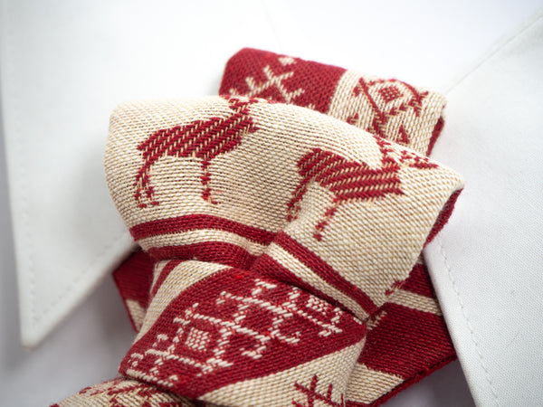 Ethnic ornaments are a timeless favourite during the winter season, adding a unique touch to any wardrobe. In Lithuania, the enchanting tales of the mythical nine-horned deer are celebrated through cherished Christmas and Advent songs. The "Nine-Horned Deer" Hopper tie by Ruty Design captures the essence of these festive traditions, making it a perfect addition to your holiday ensemble.