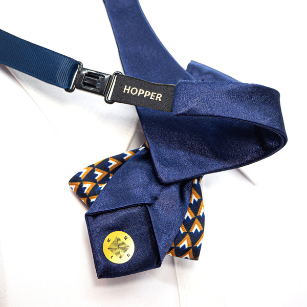 This unisex accessory is a modern combination of elements found on traditional ties and bow ties. It is recommended not to tighten the regulation strip too much: Hopper tie is at its best when leveled up with the collar line. Freestyle fashion lovers should bear in mind that this accessory also looks great with the collar unbuttoned.