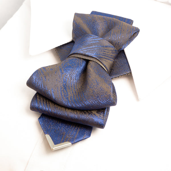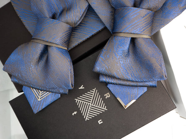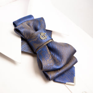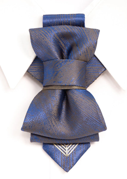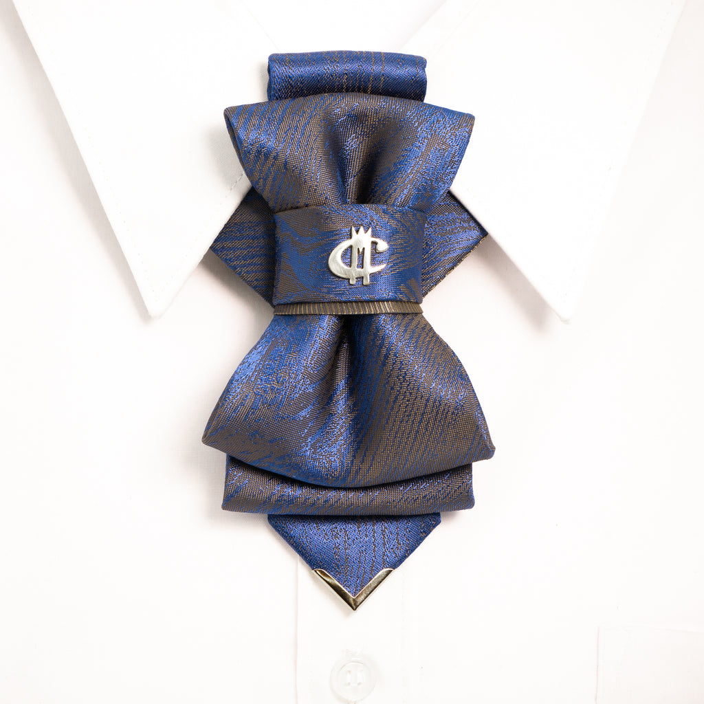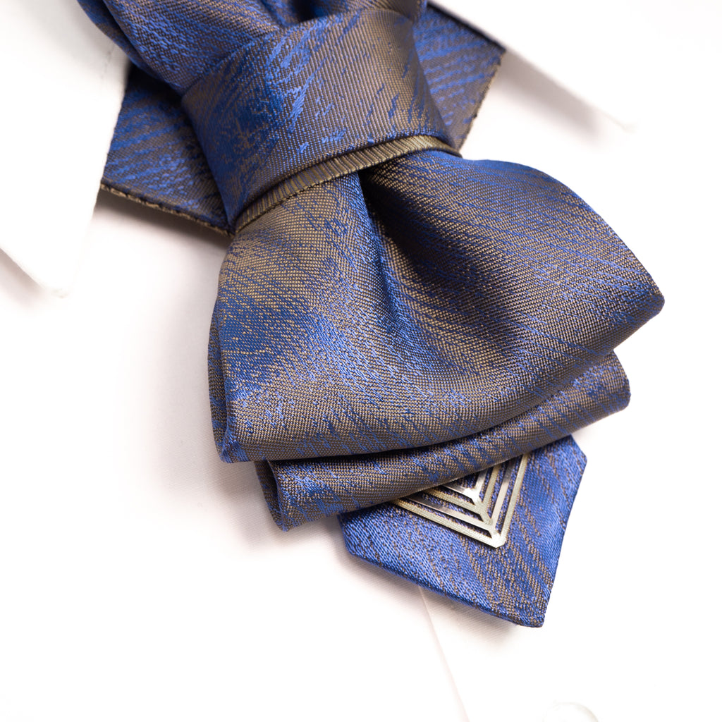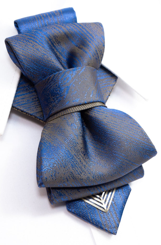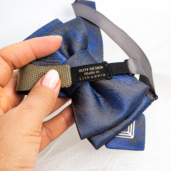 This is an accessory with a very delicate pattern and an ever-changing colour pattern. Blue and tan colours are accented with metal decor: openwork or solid V-shaped detail. Also possible to add a Lithuanian National School of Arts emblem.