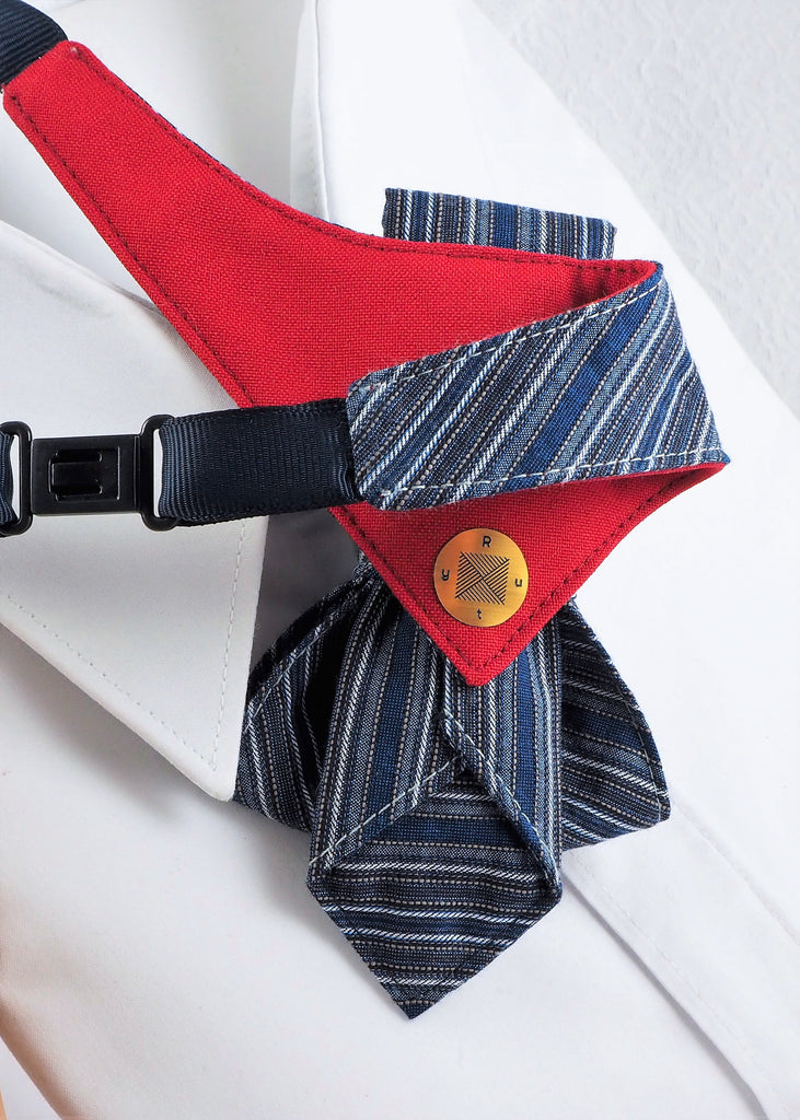 This original piece features a carefully constructed layered silhouette in a denim-inspired blue palette with fine stripes and subtle nods to military aesthetics. The structured pleats create dimension and character, while a striking red detail adds a modern twist.
