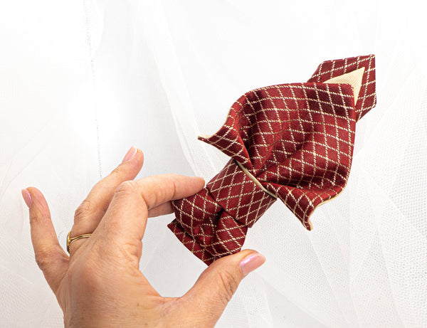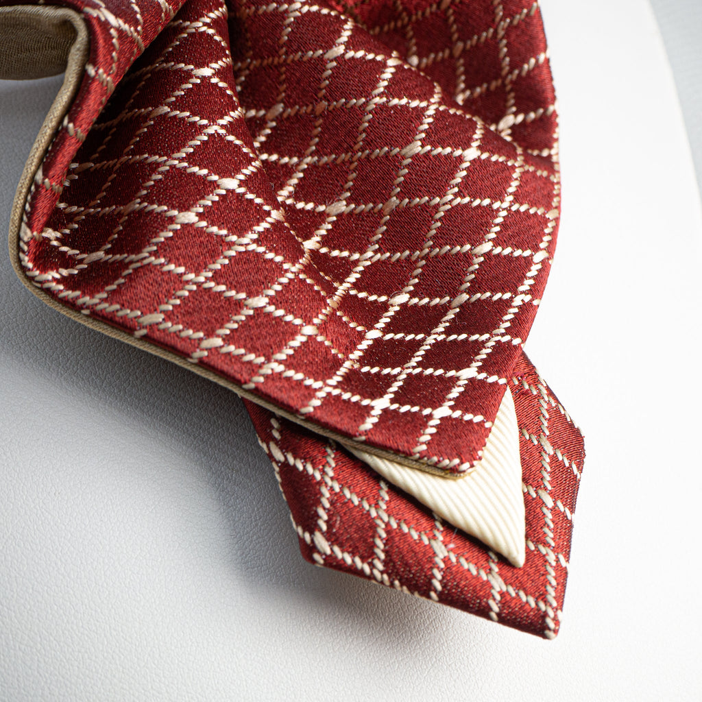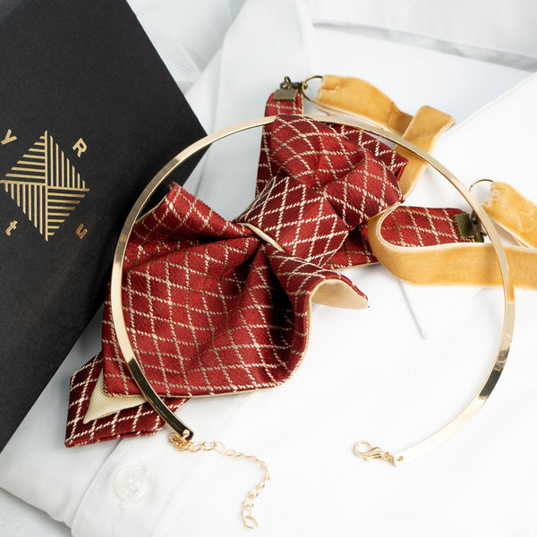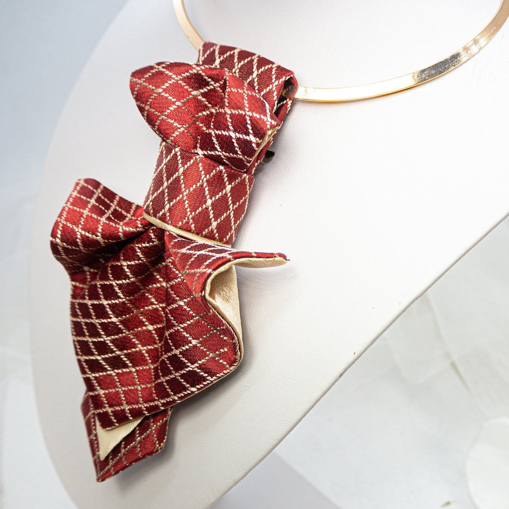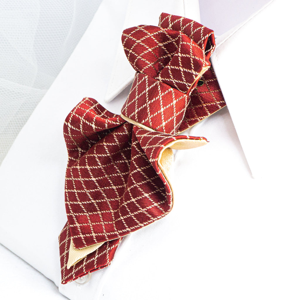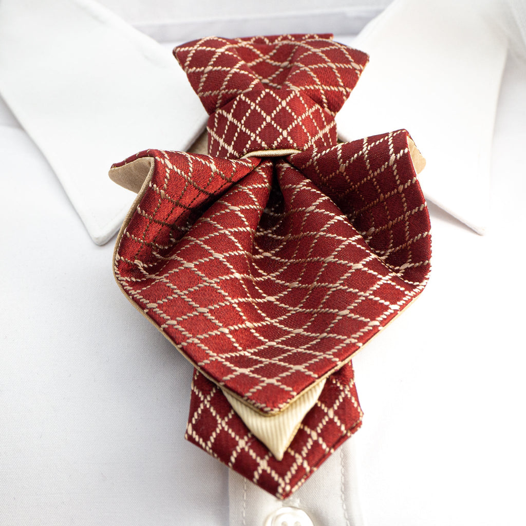 Female bow tie "Red Gothic" - geometry reigns here: white gold rhombuses and a traditional decorative triangle. The successful design of a tie is determined by the connection between the shape of the jewelry and the ornament. The raised jacquard fabric resembles the vault ornaments of Gothic architecture - ribs. In our collection, you will also find two models for men, made of this fabric . We also have a red version.