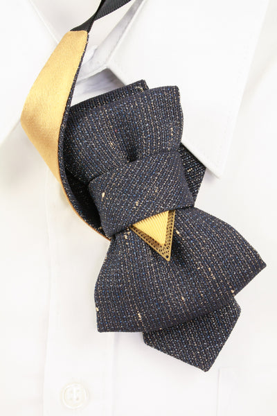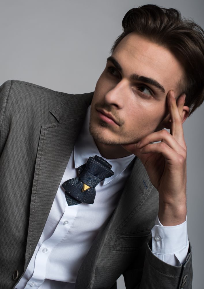 History – a neck accessory for men with an additional element of décor giving a neat contrast. The color palette that is of reminiscence to a classic tweed with blueish-grey color tones, decorated by subtle yellow-colored threads that give a historic feel to it. A classical Hopper with the yellow part reminding the essential characteristic of a Ruty design – a triangle, brings a slight rebellious quality to a classical style.