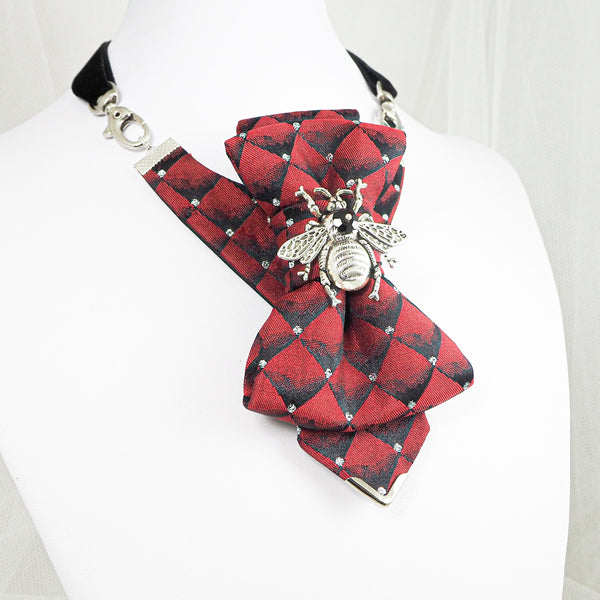 Woman in a black suit with a red necklace standing in a modern office uxury necktie, unisex bow tie, red statement tie, bee brooch accessory, handmade fashion tie, modern neckwear, artistic bow tie, designer hopper tie, unique suit accessory, bold red tie, gothic elegant necktie, men women formal tie, statement jewelry neckwear, wedding bow tie, opera concert accessory, victorian style tie, black suit accent, couture neckpiece, stylish formal accessory, dramatic bow tie