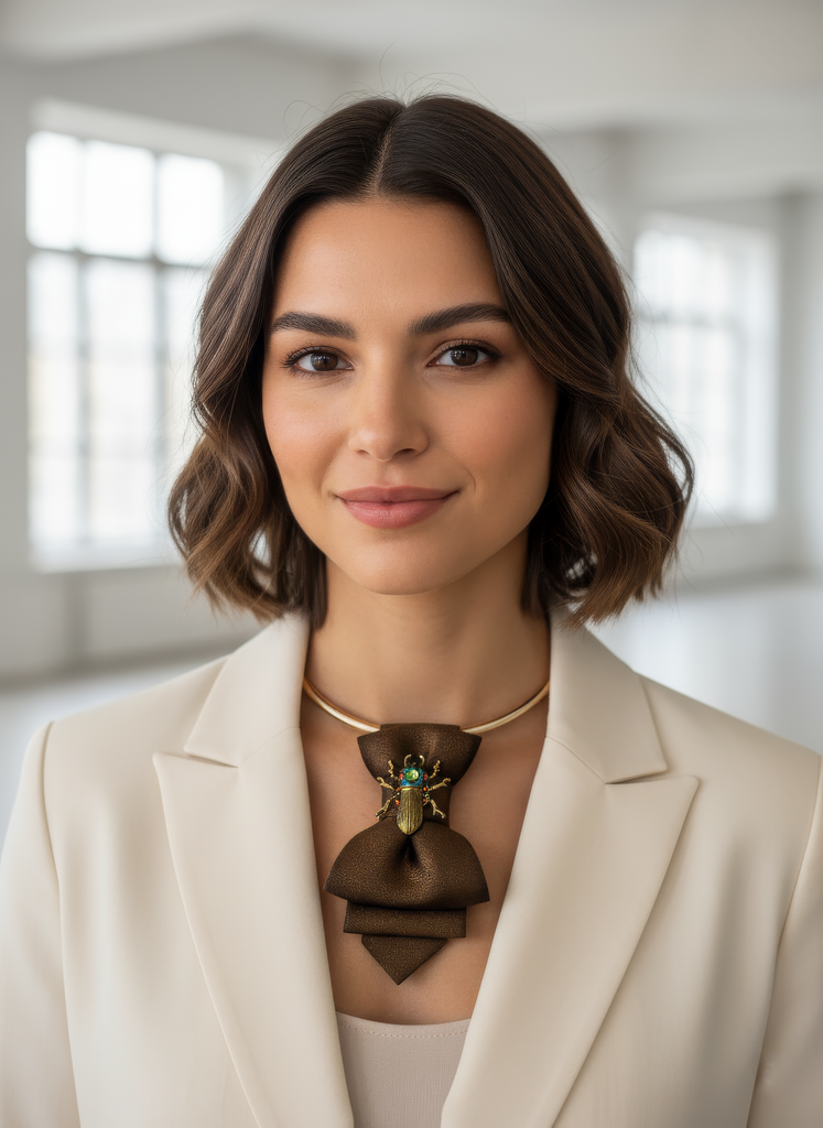 Woman wearing a beige blazer and a unique necklace with a blurred background Woman, beige blazer, brown bow-tie necklace, beetle pendant, modern setting