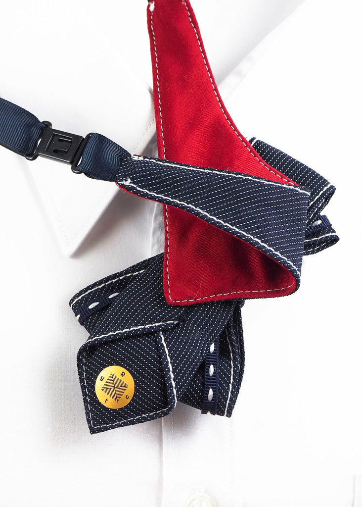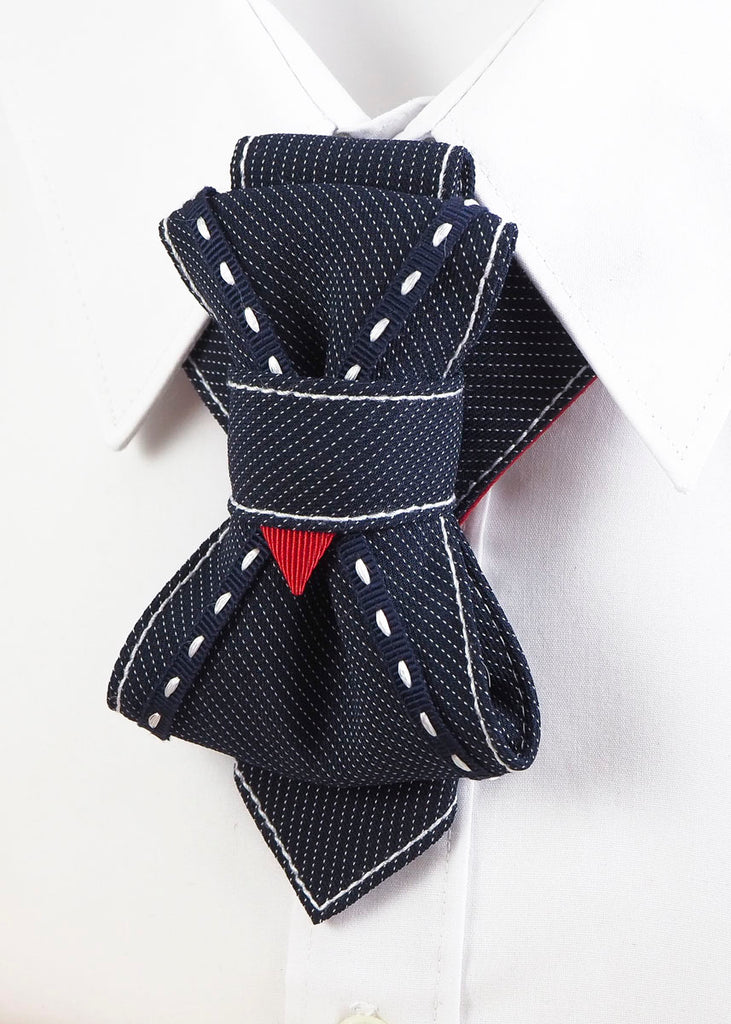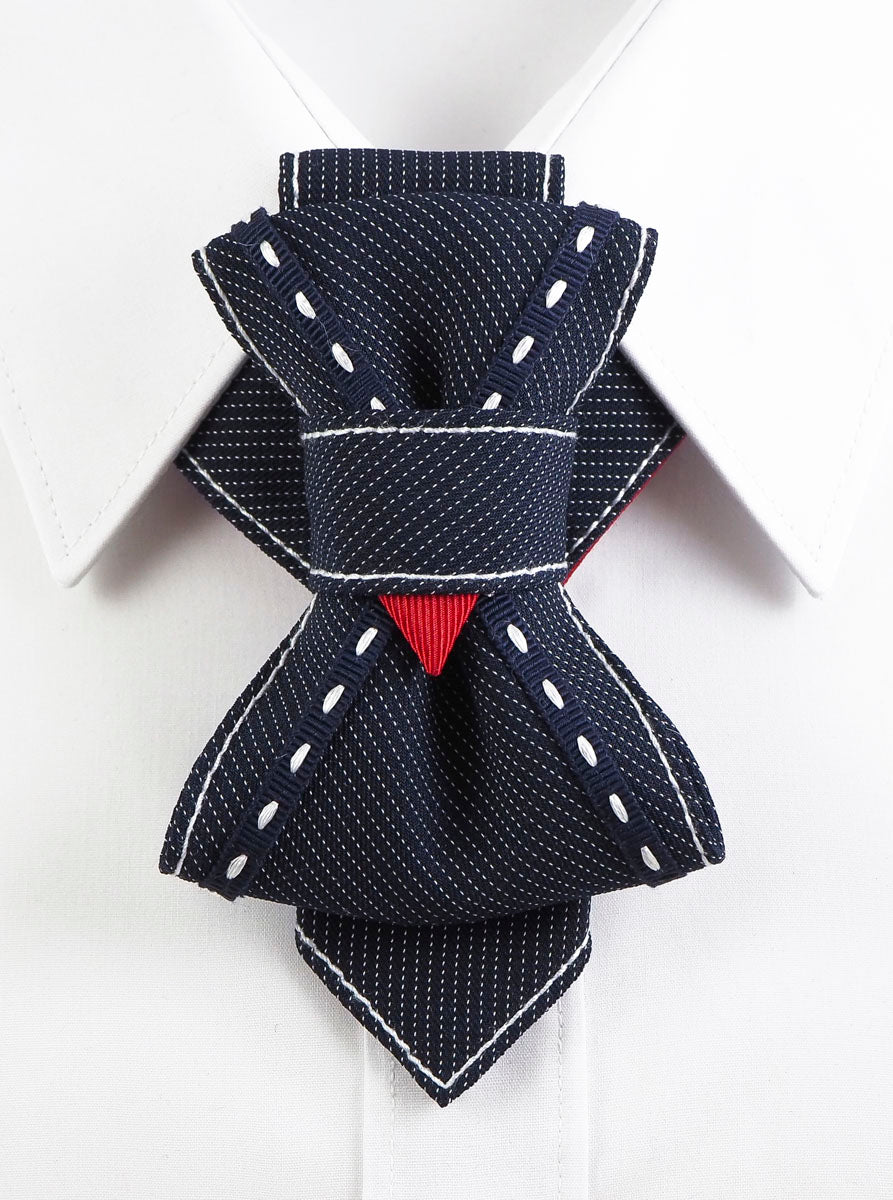 Crafted with meticulous care, this exclusive neckpiece features a deep navy fabric enhanced by fine white pinstripes and decorative saddle stitching. A subtle pop of red at the center adds a modern, unexpected twist – a nod to those who aren't afraid to break tradition beautifully.