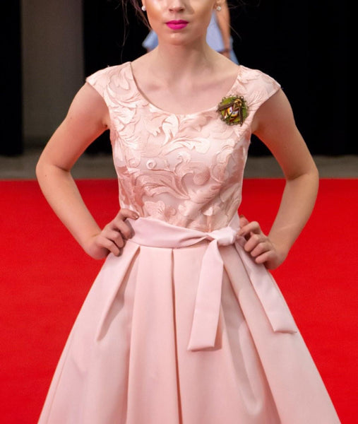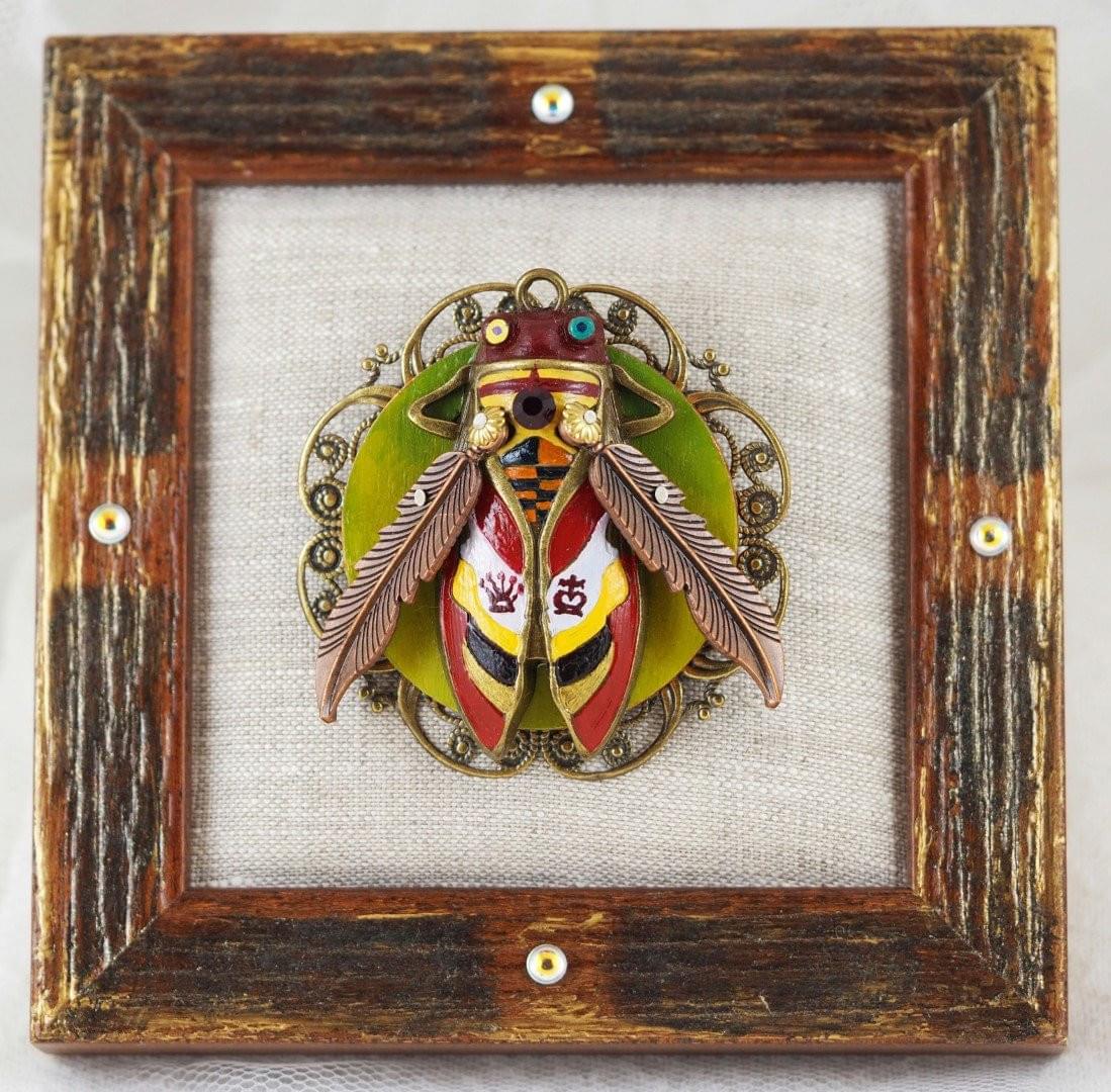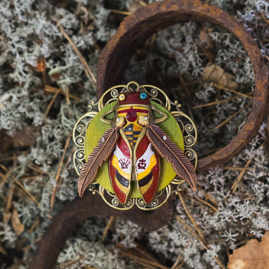 The core part of jewelry is an oval-shaped brass plate to which decorative wooden piece is attached (on top of which the decorative beetle is mounted). The exterior is decorated by using classical oil paint technique. The accessory is decorated with crystals and is covered by a sprayed protective polish layer. A locking clasp is added.