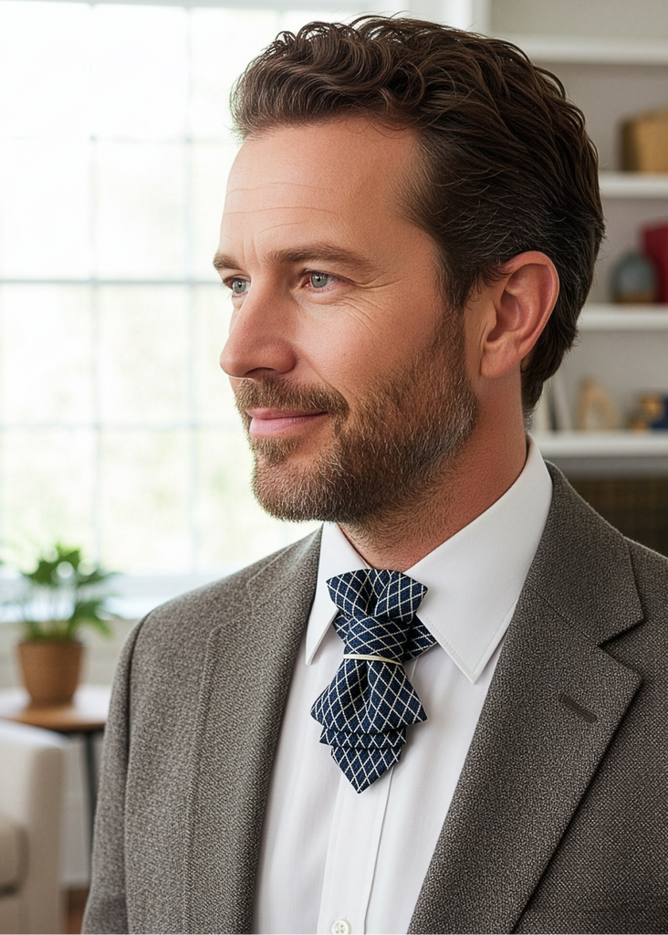 Men's hopper tie "Blue gothic" - success of this hopper tie is the combination of shape and print. The main accent is geometric ornamentation, white gold-colored jacquard diamonds. Therefore, this accessory will be a special highlight of any outfit. This tie combines luxury and sophistication. So subtle that it can be applied even in everyday life. It goes perfectly with a blue, gray or beige suit. But you'll be surprised how well it blends into an outfit consisting of blue jeans, light blue shirt and a more casual jacket.