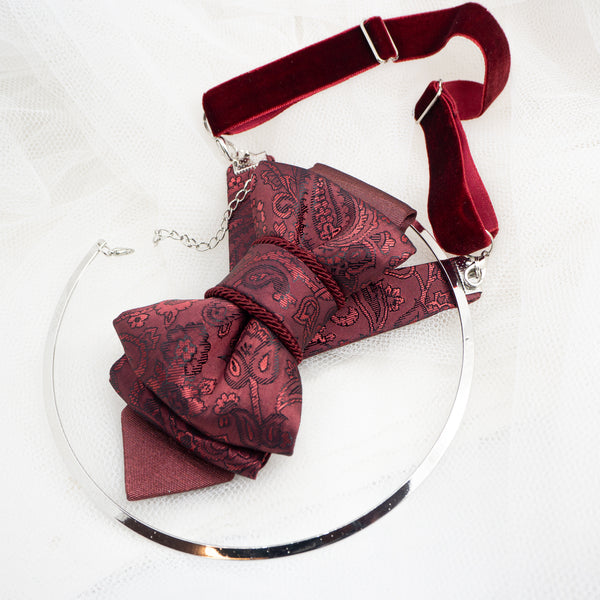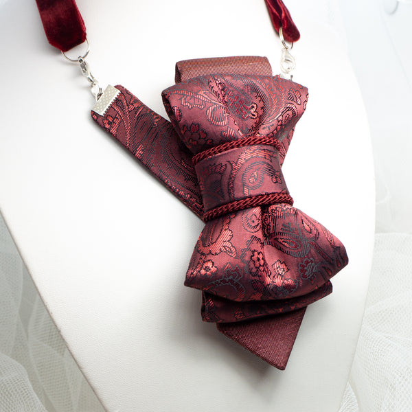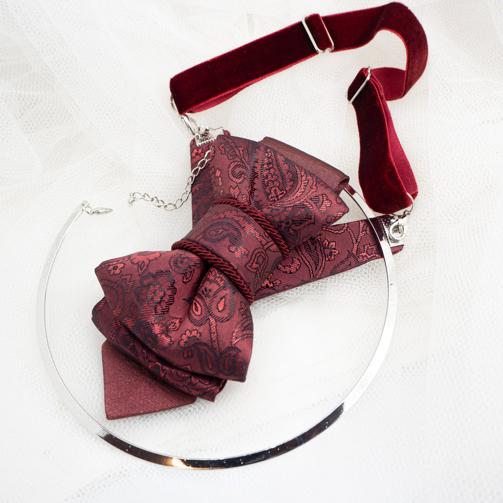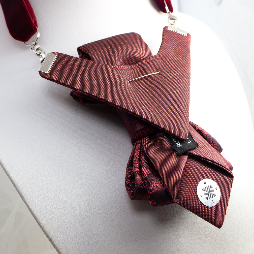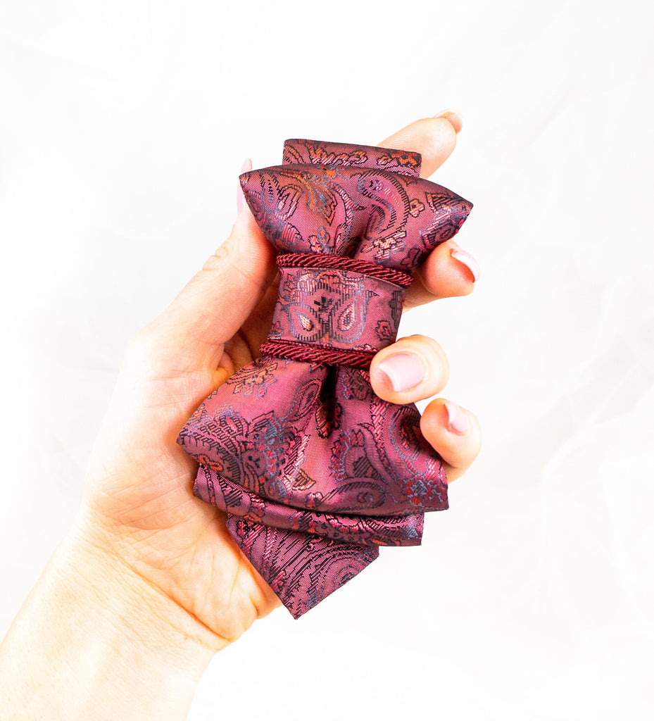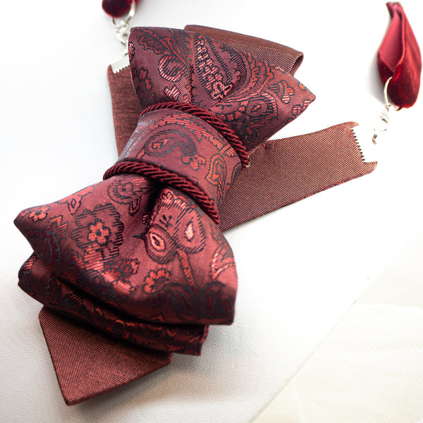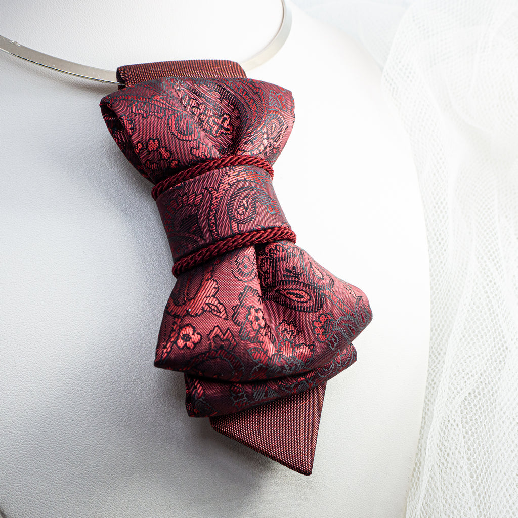 red bow tie, vertical bow tie, luxury womens tie, handmade tie, statement neckwear, unique bow tie, elegant tie for women, double-sided tie, brooch tie, pendant tie, rose wine tie, wedding accessory, business fashion, fashion necktie, Rūta Piekurienė design, artistic tie, unisex tie, special occasion tie, decorative tie, floral pattern tie, modern bow tie, Lithuanian handmade, pre-tied bow tie, gift for her