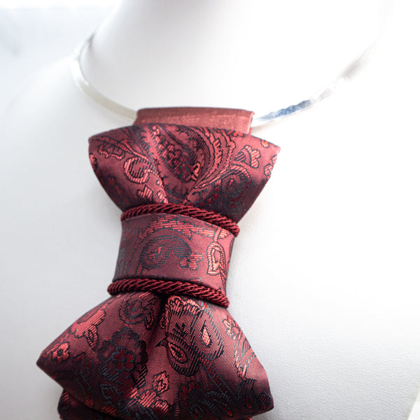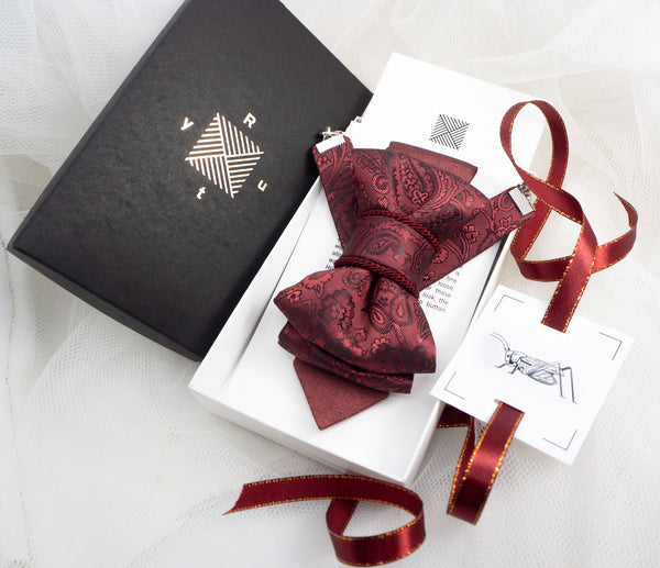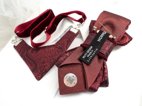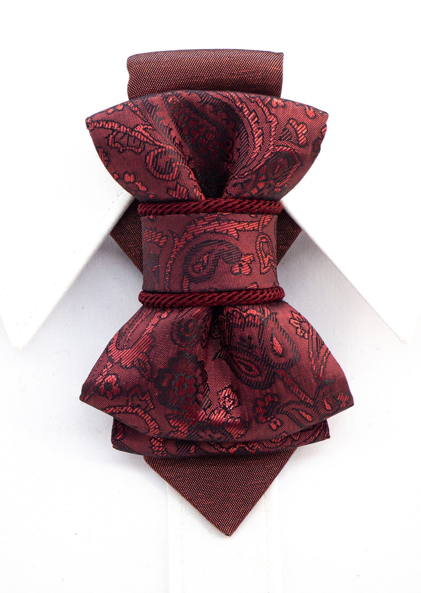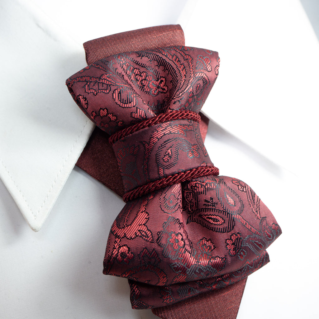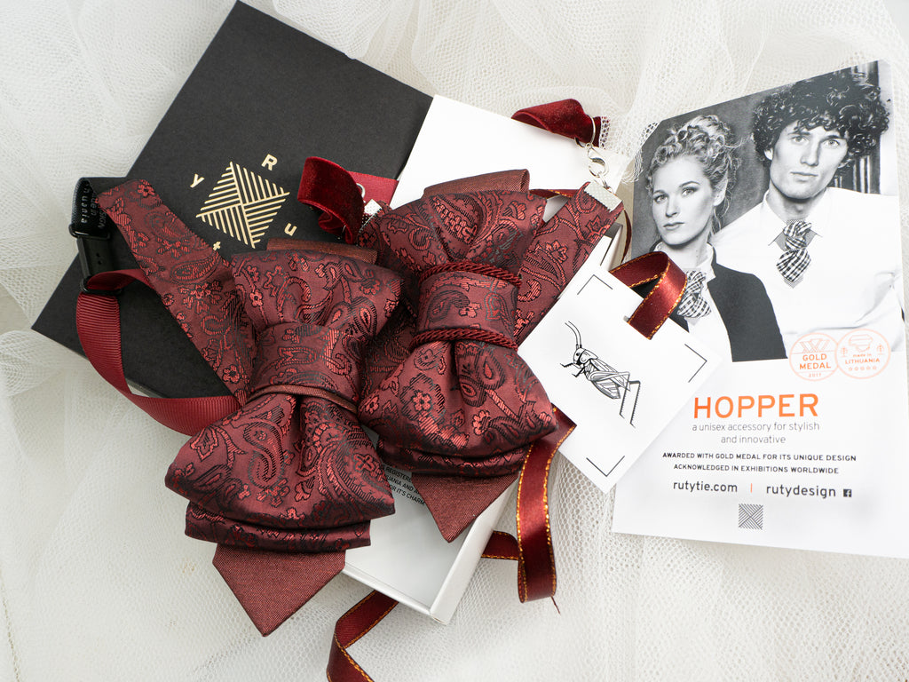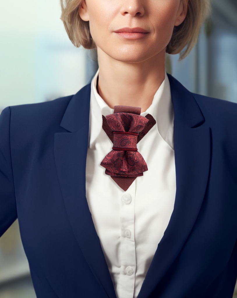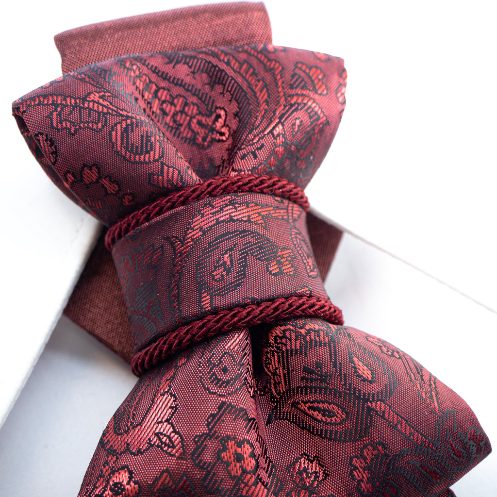 red bow tie, vertical bow tie, luxury womens tie, handmade tie, statement neckwear, unique bow tie, elegant tie for women, double-sided tie, brooch tie, pendant tie, rose wine tie, wedding accessory, business fashion, fashion necktie, Rūta Piekurienė design, artistic tie, unisex tie, special occasion tie, decorative tie, floral pattern tie, modern bow tie, Lithuanian handmade, pre-tied bow tie, gift for her