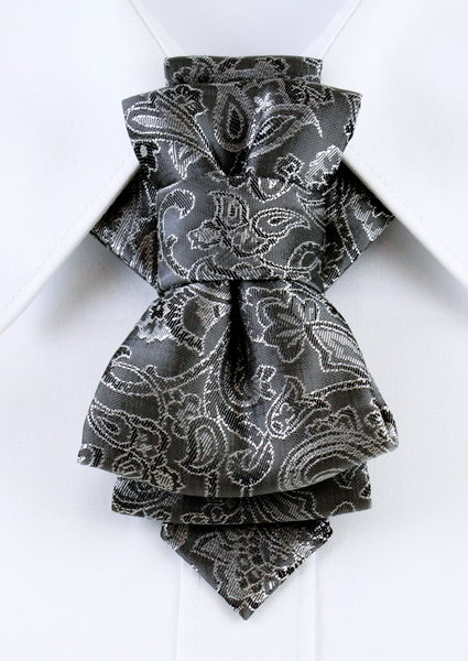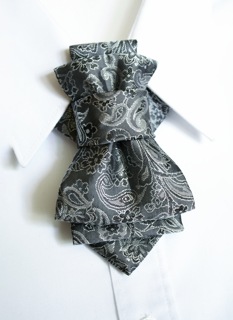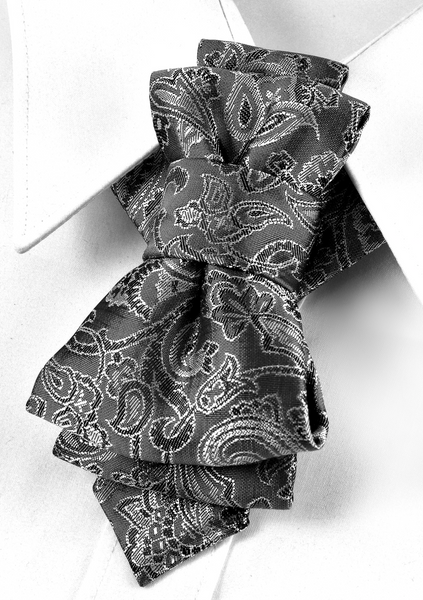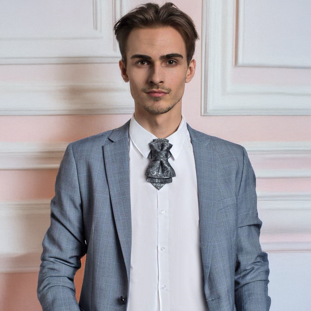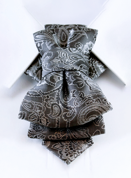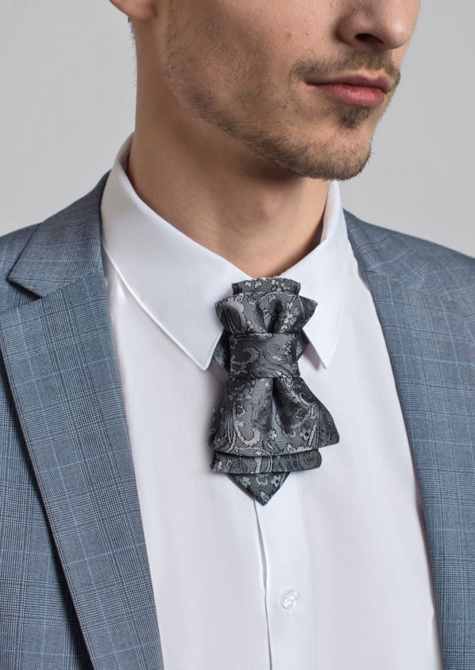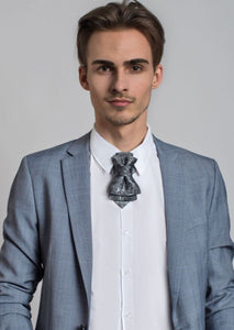 A true fusion of artistry and elegance, this RUTY TIE reimagines classic fabric patterns in a bold, innovative shape. Featuring an exquisite blend of grey and silver tones, intertwined with intricate Eastern floral motifs, the luxurious satin fabric catches the light beautifully, adding depth and sophistication.