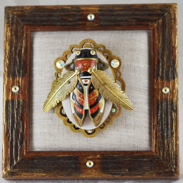 The main elements of an accessory is oval-shaped wooden plate covered with metal plate. The exterior of the beetle is decorated using classical oil paint technique. Miniature design is enriched by crystals. Covered by sprayed protective polish layer.