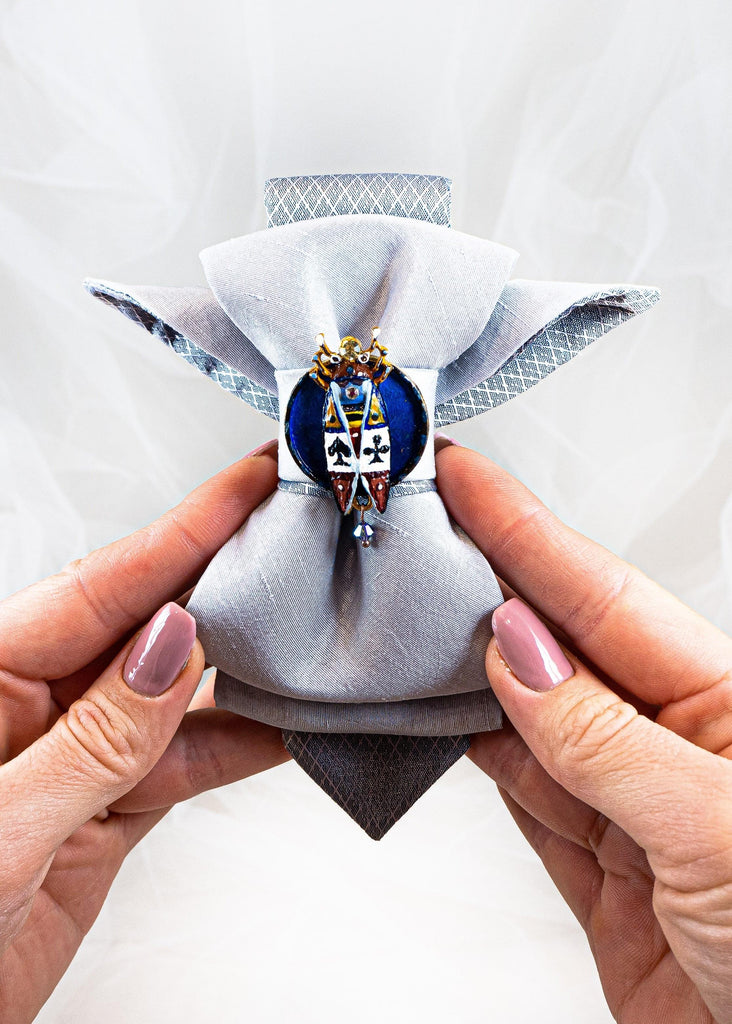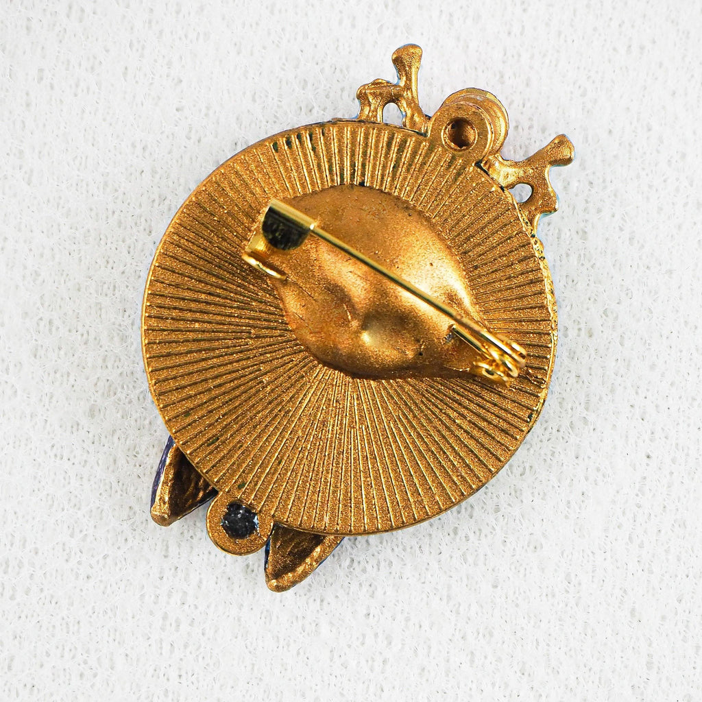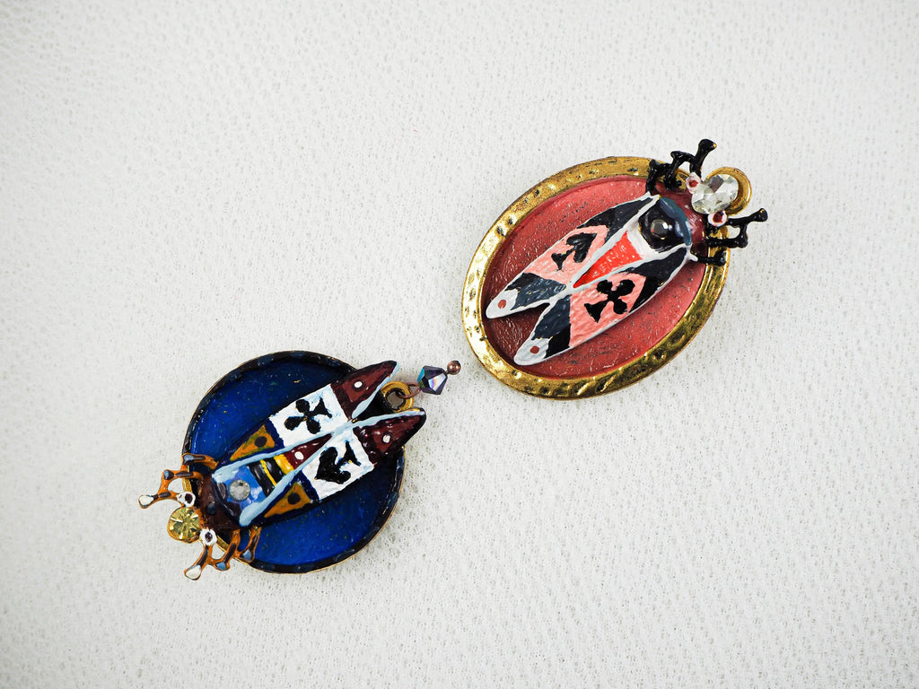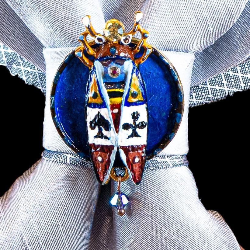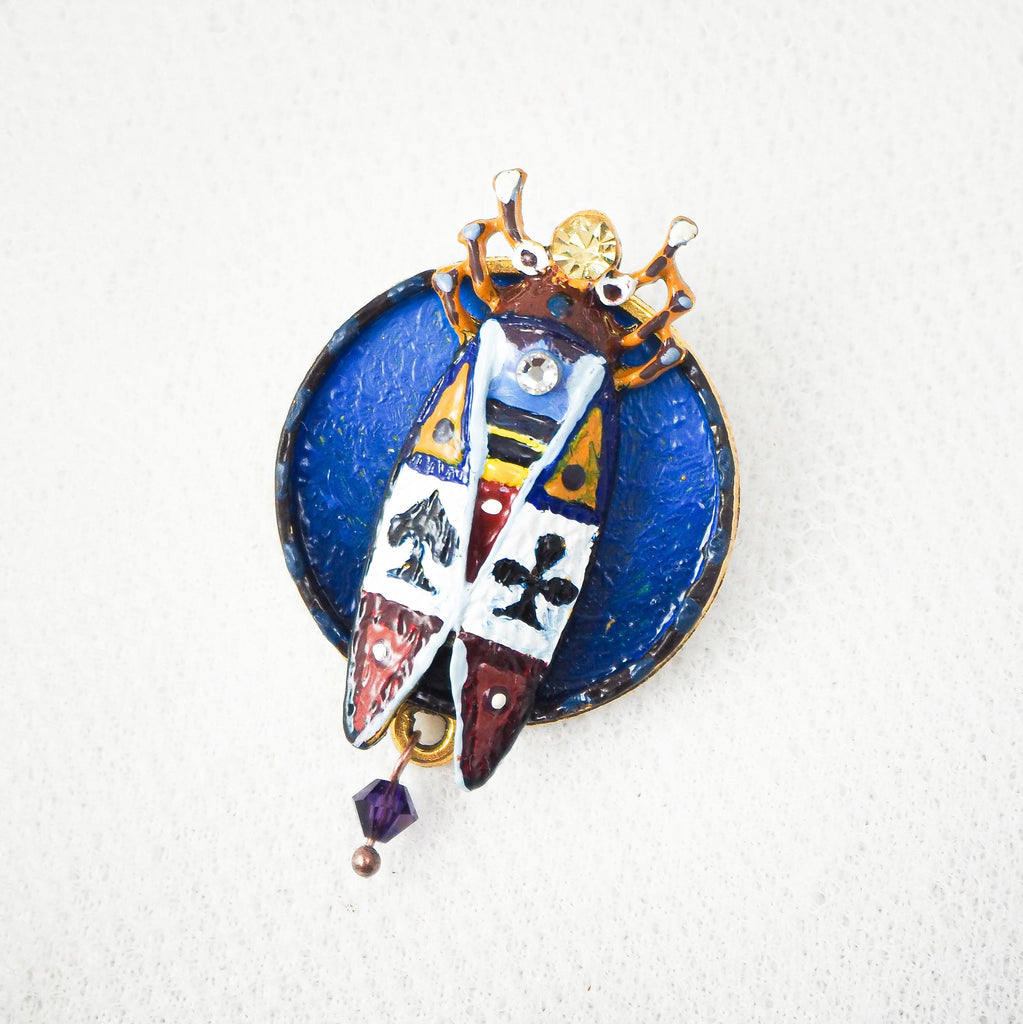 The core part of jewelry is an oval-shaped brass plate to which decorative metal beetle is mounted. The exterior is decorated by using classical oil paint technique. The accessory is decorated with crystals and is covered by sprayed protective polish layer. Lock clasp is added. It is created to be on Hoppers, jacket flaps, dresses, and other clothing pieces.