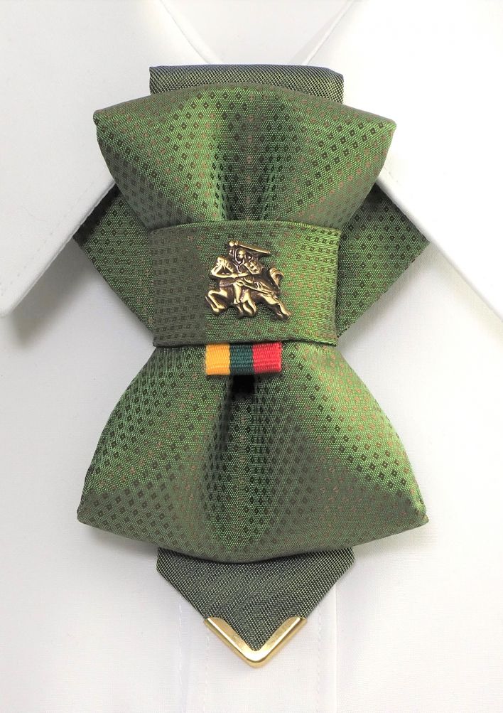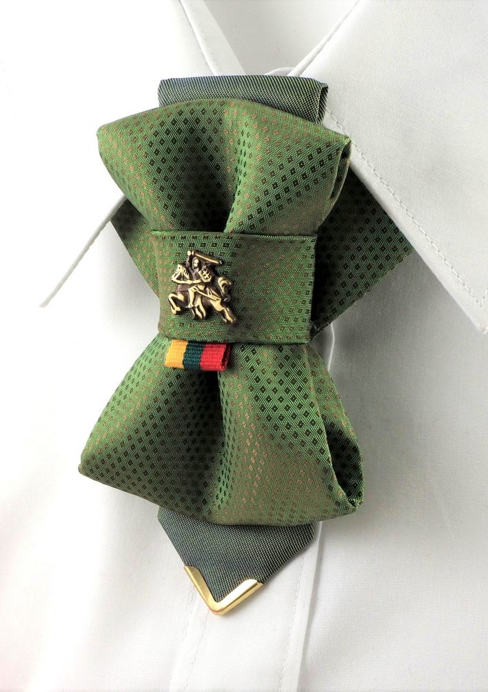 A creation of satin fabric enriched by small rhombus-shape elements of décor making it a great fit for the brass-made symbol and flag of Lithuania. This particular Ruty tie embodies spring vitality at its finest – an accessory for both men and women. A perfect fit for color palettes of nature-like tones. It also works well when in combination with contrasting blue color suits.