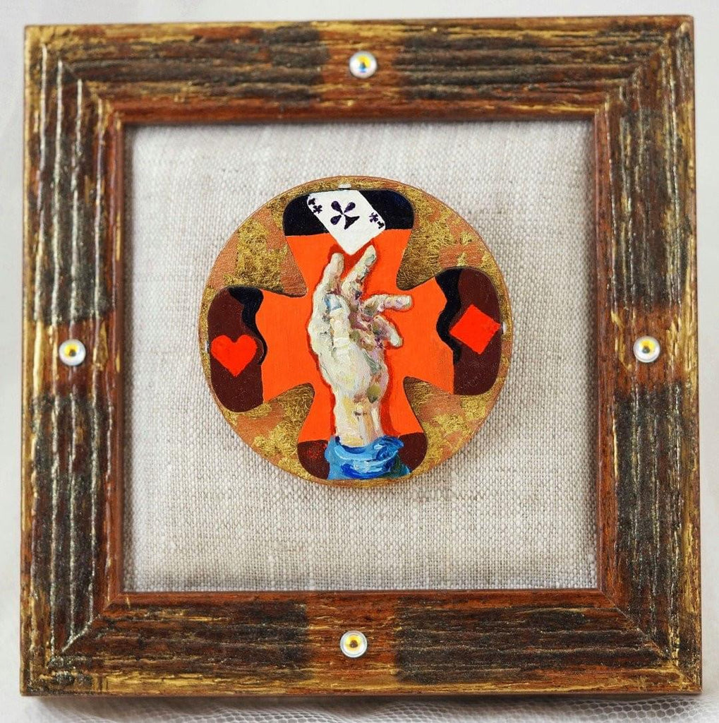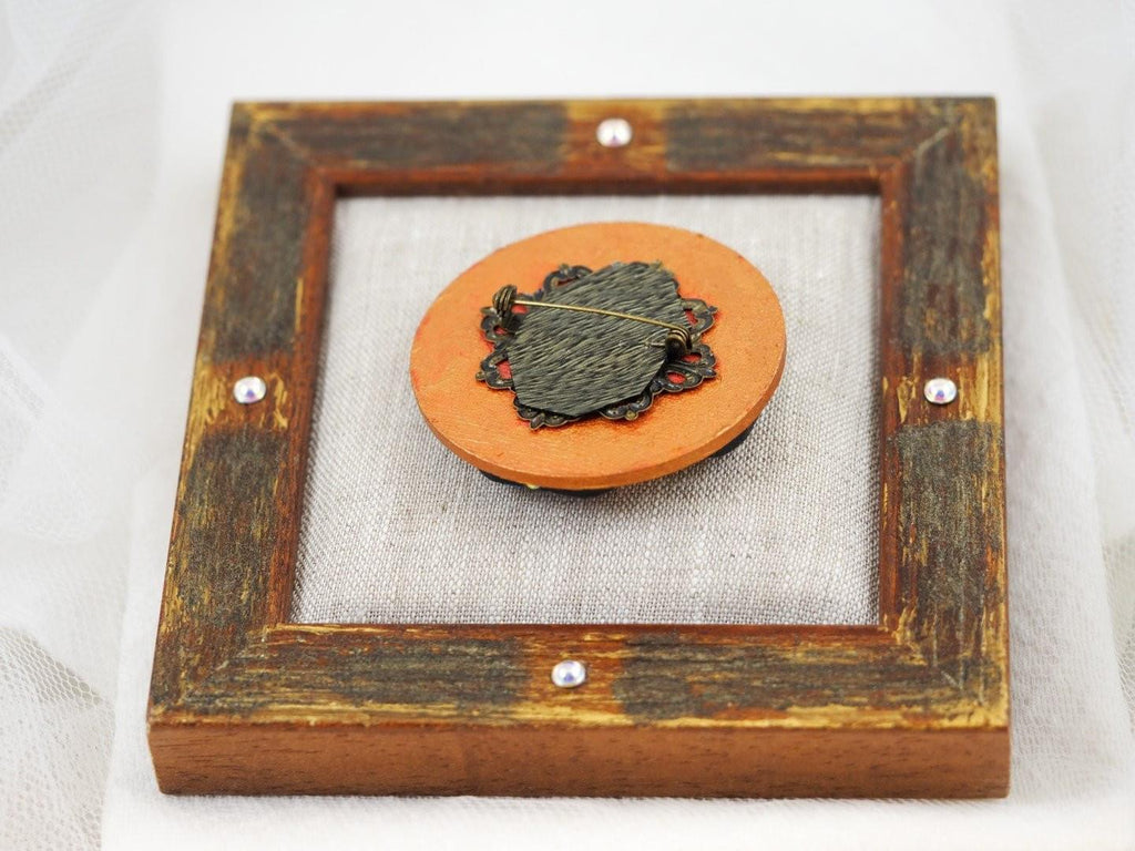 The main element of an accessory is an oval-shaped wooden plate covered with gold foil. This was achieved using the classical oil paint technique. The accessory is decorated with crystals and is covered by sprayed protective polish layer. Lock clasp is added.