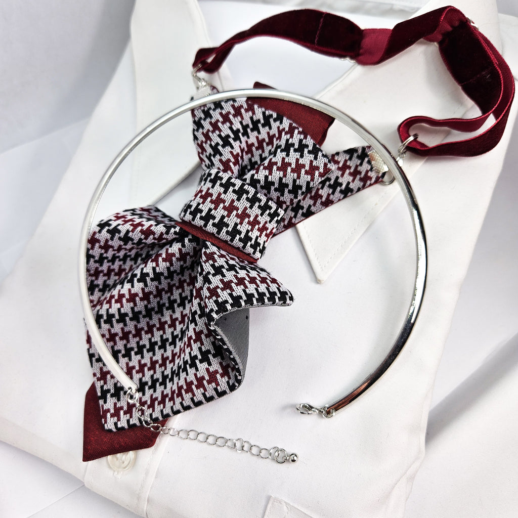 This piece reimagines the traditional houndstooth pattern—often linked to strict, tailored fashion—infusing it with boldness, refinement, and contemporary flair. Its vertical, layered, bow-inspired silhouette transforms the tie into a striking statement accessory. Intricate construction and patterning create a dynamic visual rhythm that remains impeccably elegant and luxurious. Handcrafted with care, it carries an artistic charm and a distinctly high-quality feel.