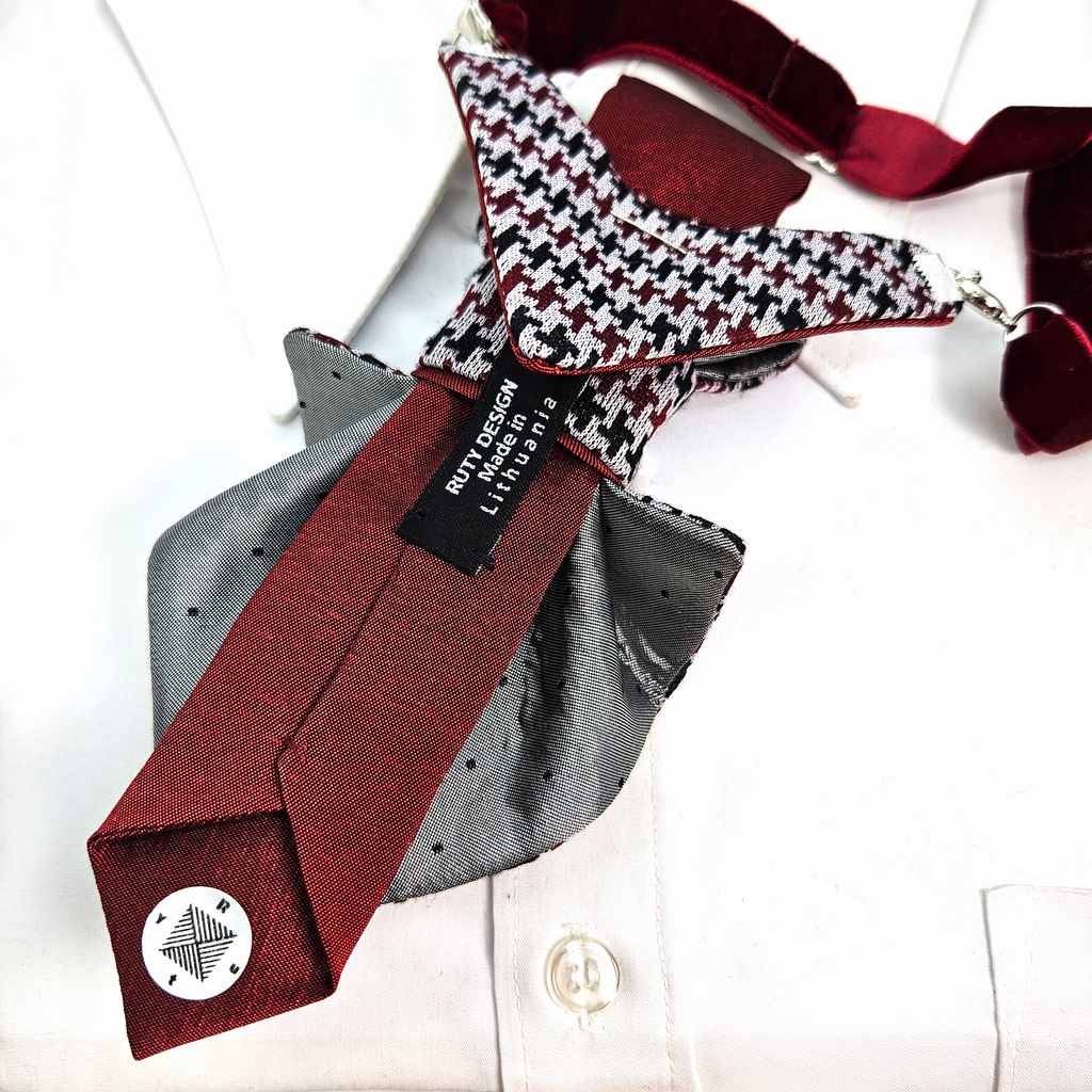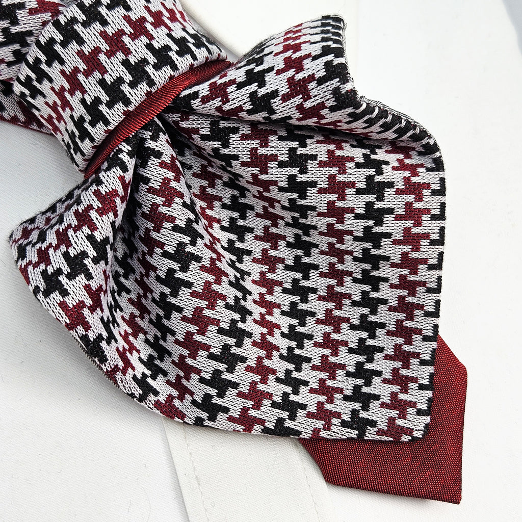 Houndstooth patterned bow tie with red accents on a white shirt premium handmade knitted houndstooth tie in burgundy, luxury italian silk wool blend necktie with red pied-de-poule pattern, unique red and black patterned tie for wedding or business attire, close-up of high-quality wool knit scarf style tie with abstract design, elegant burgundy and black dogtooth patt