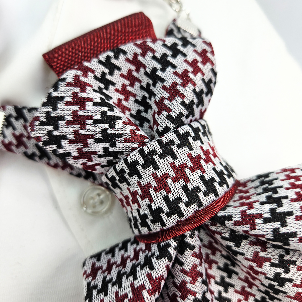 Houndstooth patterned bow tie with red accents on a white background premium handmade knitted houndstooth tie in burgundy, luxury italian silk wool blend necktie with red pied-de-poule pattern, unique red and black patterned tie for wedding or business attire, close-up of high-quality wool knit scarf style tie with abstract design, elegant burgundy and black dogtooth patt