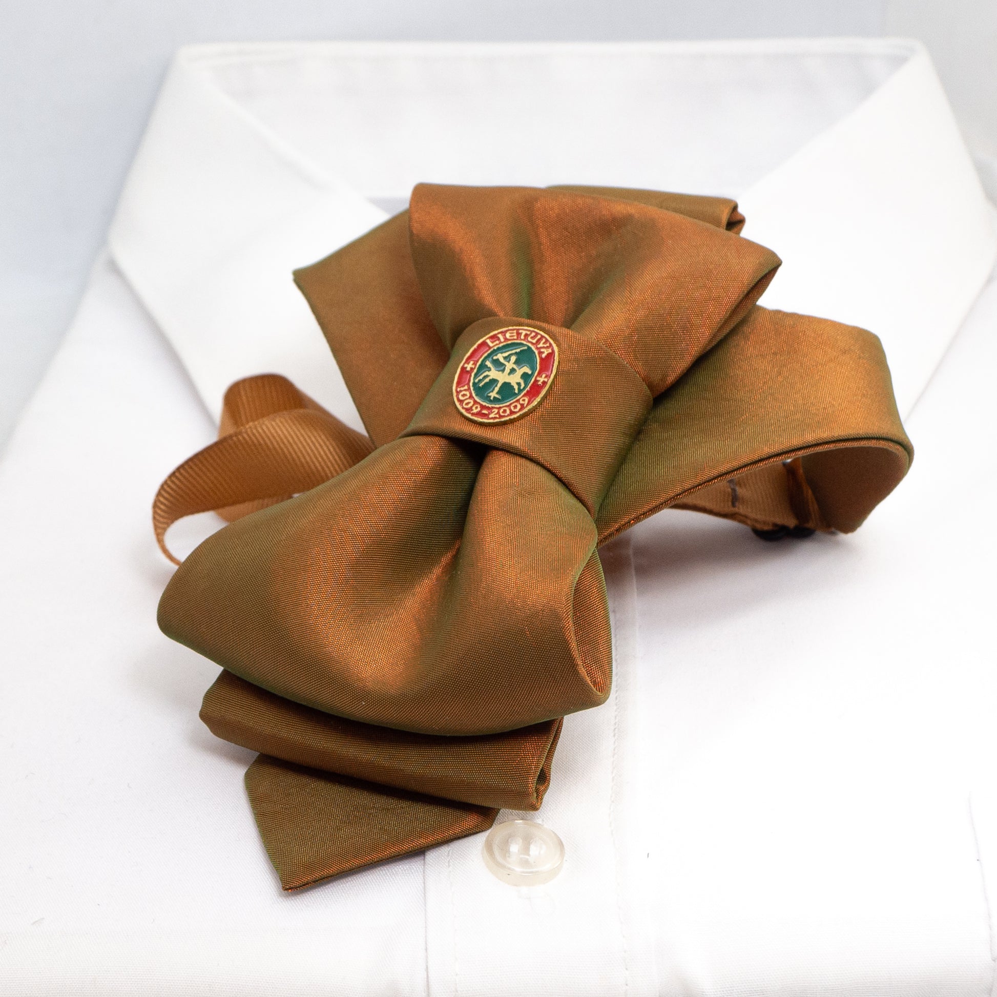 In 2009, the 1000th anniversary of the commemoration of Lithuania was celebrated. To honour this impressive anniversary, we created a Ruty Design Hopper tie.The luxurious knot is tied from a complex multi-dimensional fabric. It delicately intertwines mustard, brown and green tones. The Hopper tie is decorated with a commemorative badge “Vytis”