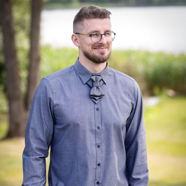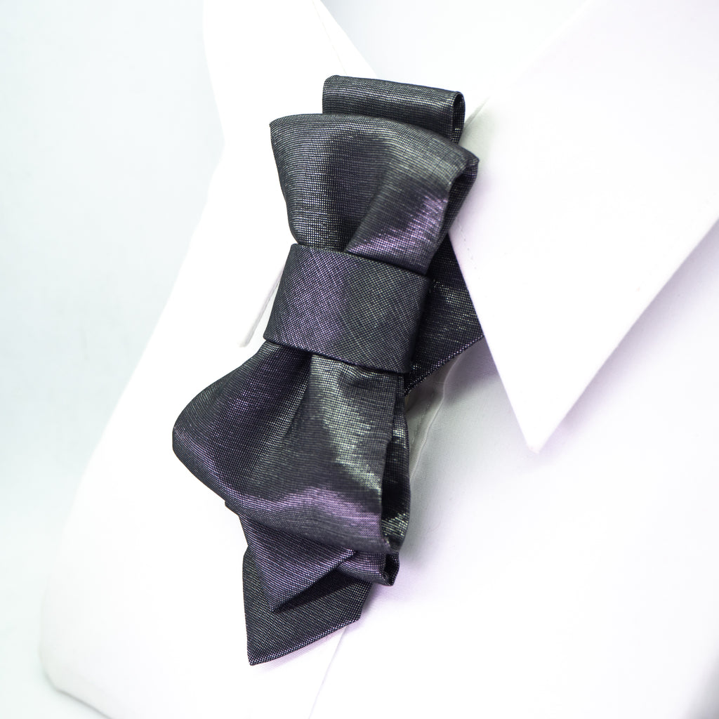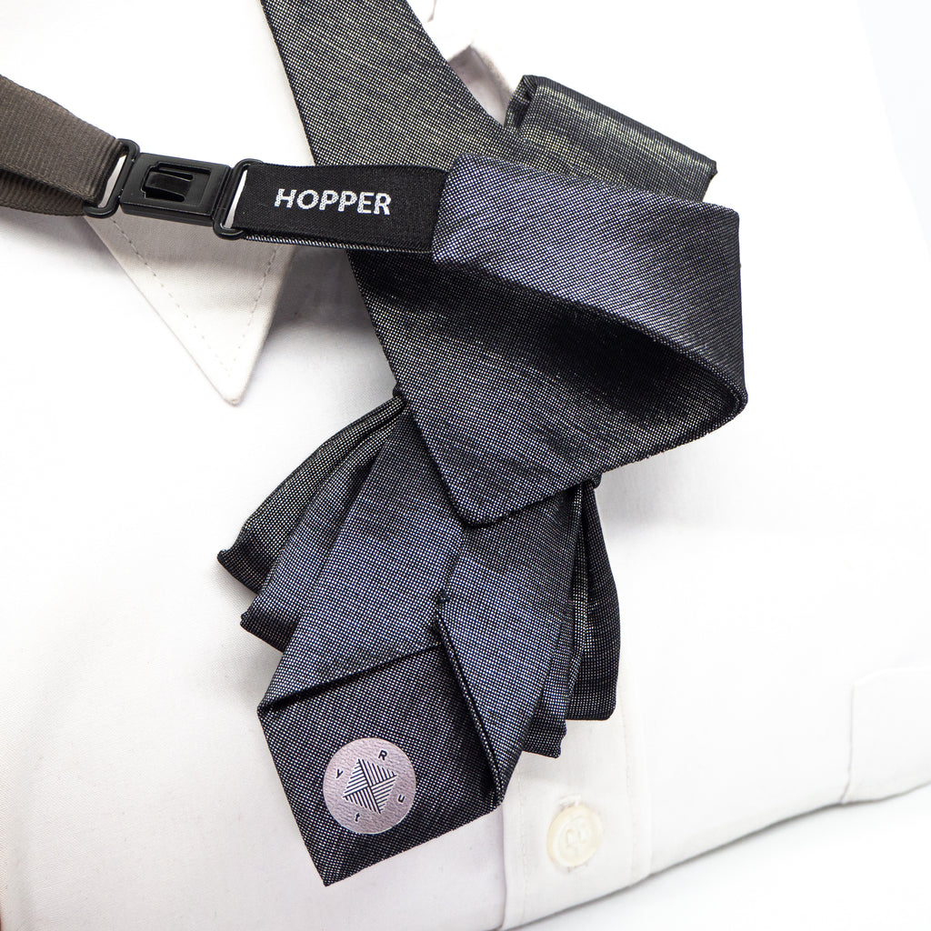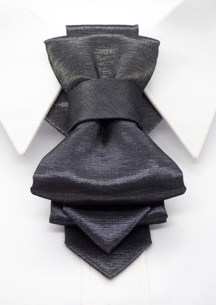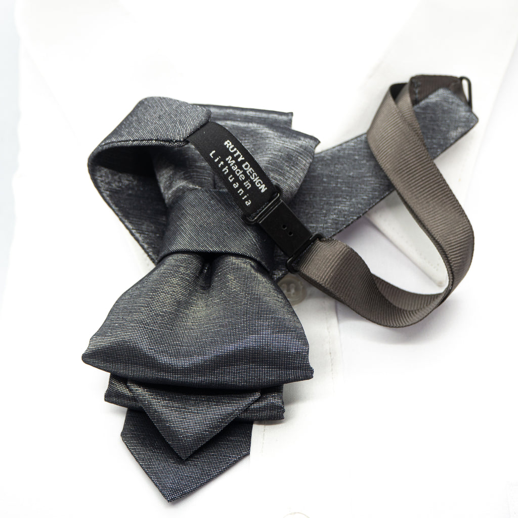 This piece should definitely be worn by the the star of the evening. If you are getting ready for a wedding, you need to dazzle on a stage, you are a musician or an artist, then choose this delicately glowing tie. Hopper tie "Silver origami" was inspired by a unique Japanese tradition. The intricate play of fabric folds really brings this Japanese-inspired craftsmanship to life. This is a rather special Hopper tie. Grey with a slight silvery glow visible when light hits.