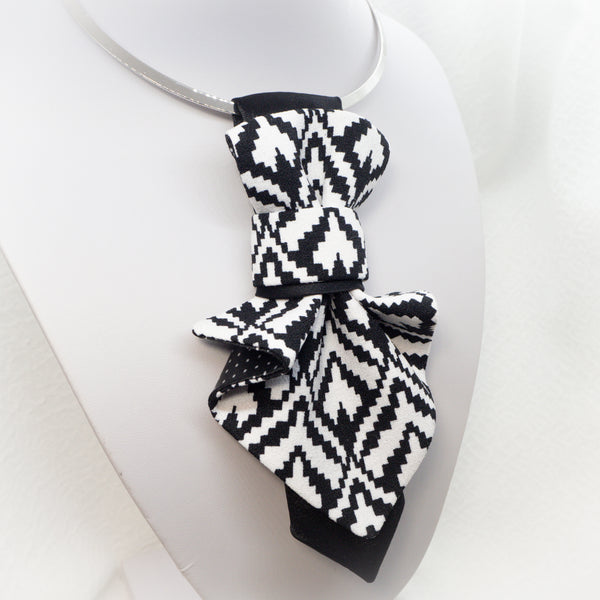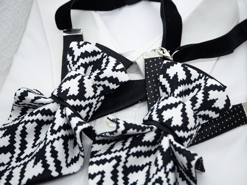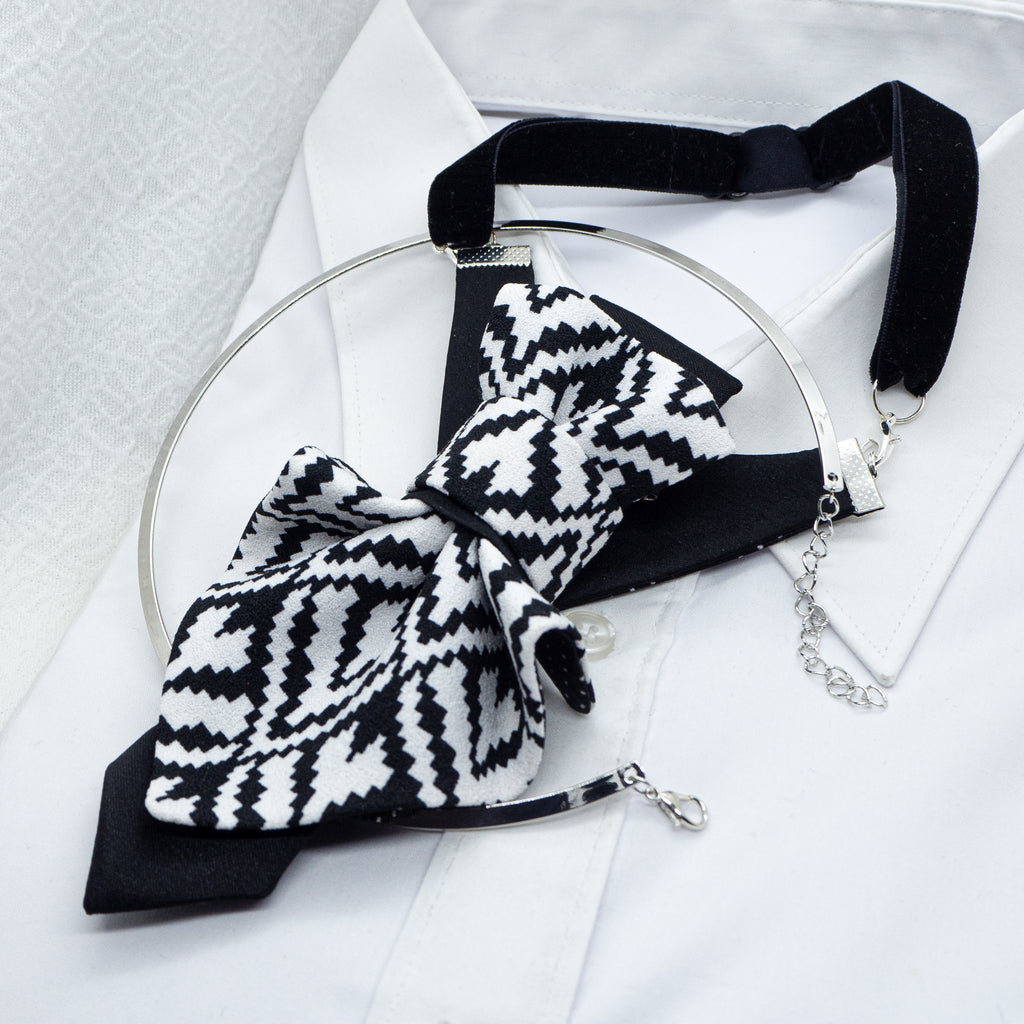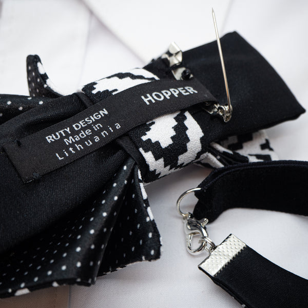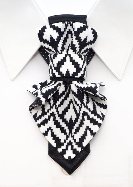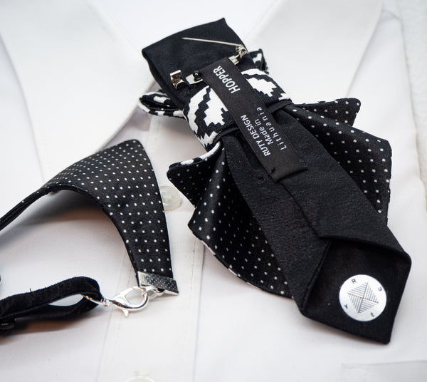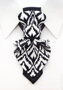 Jabot -Hopper tie "Zigzag" is a special model of women's Ruty Design ties, reminiscent of the pleated collar decor pieces of the 18th century. Classic ornament of geometric figures, framed by black elements. A combination of zigzags and playful dots is combined in the double-sided jabot. The classic, always relevant, combination of black and white looks new again in the original, wavy shapes of the tie.