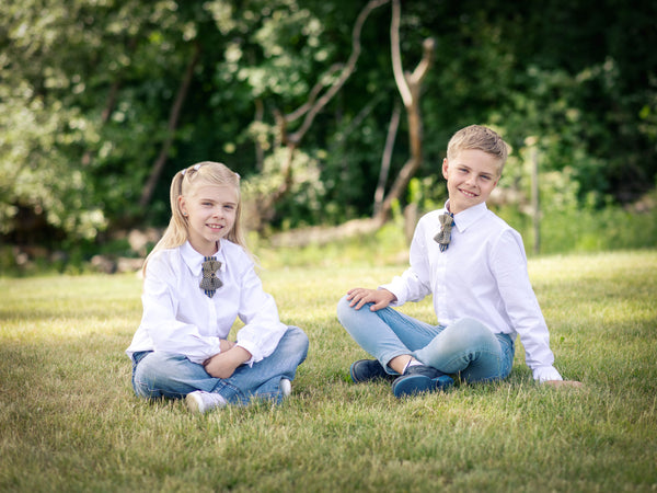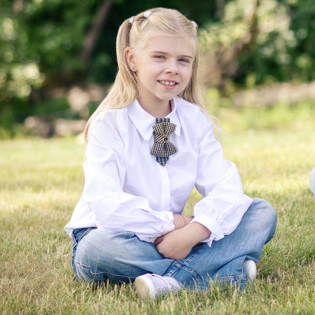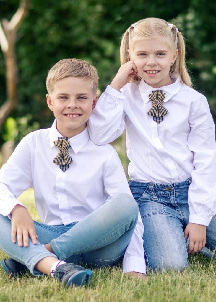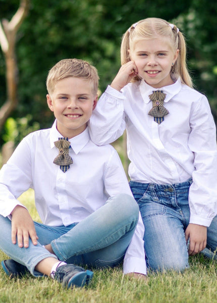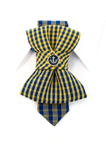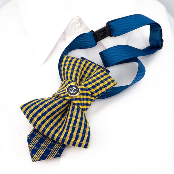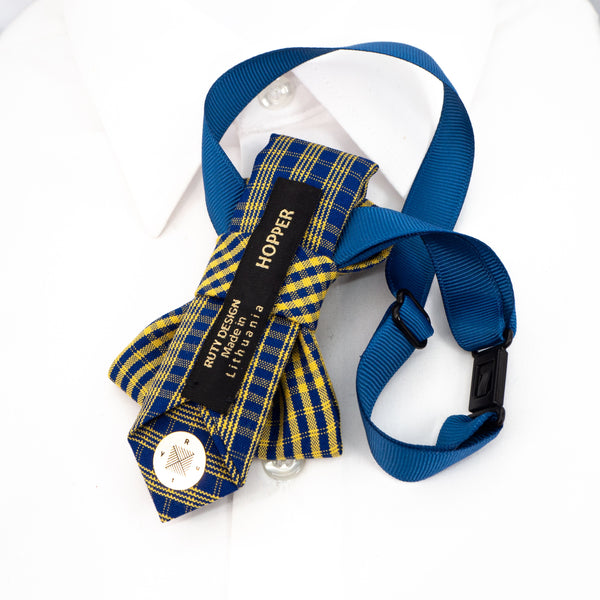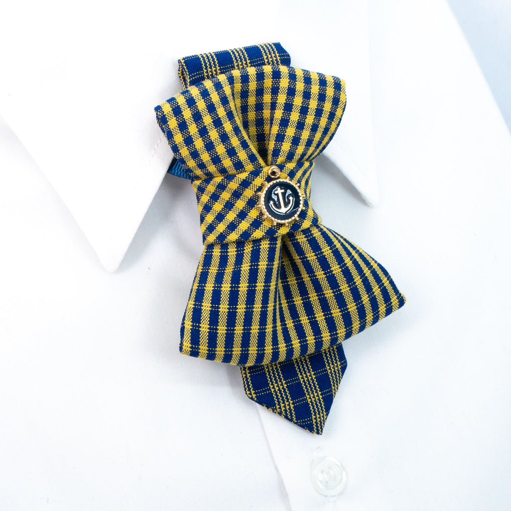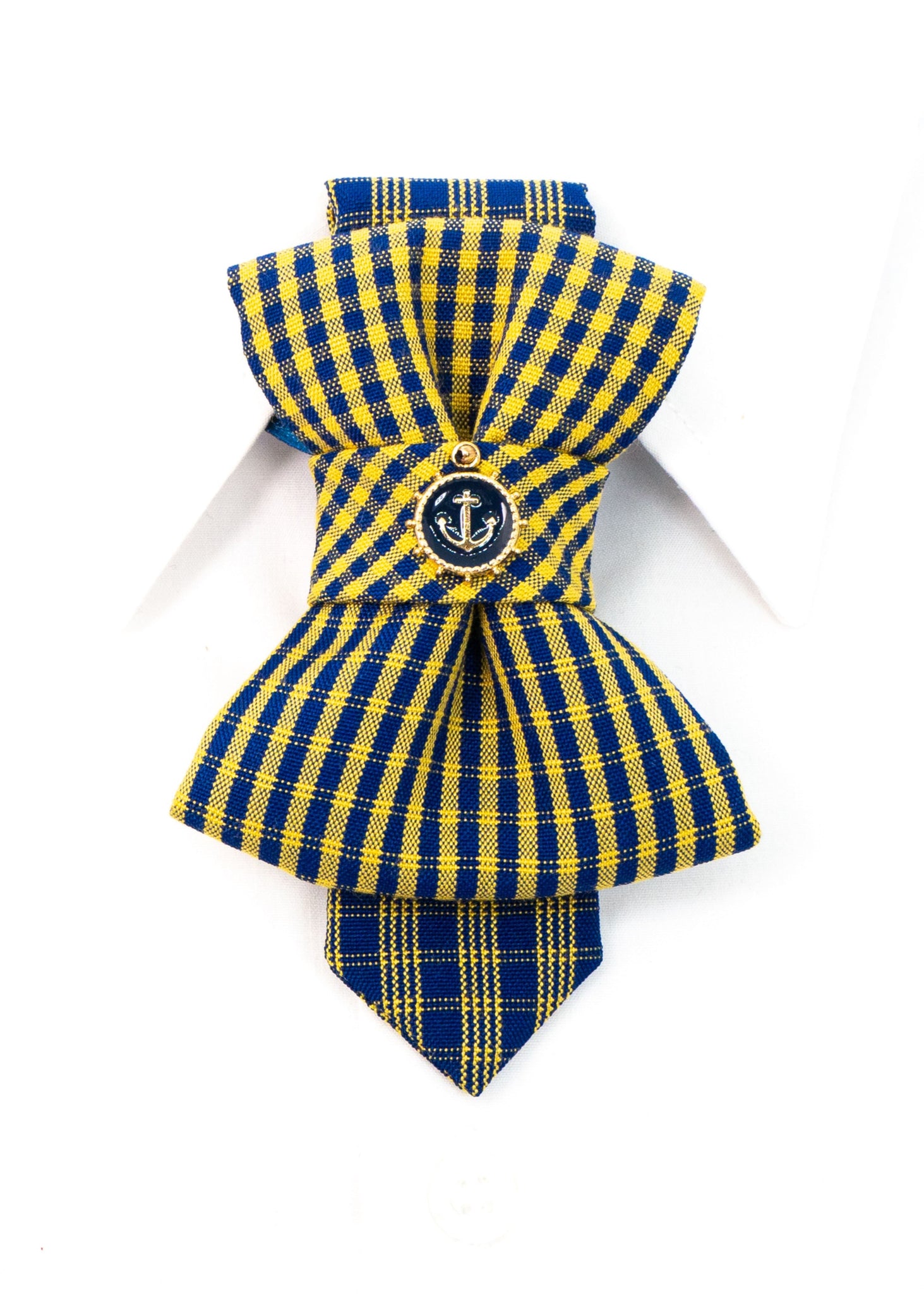 Our cheerful checkered children's Hopper tie is perfect for any party or academic environment. With its yellow and blue checks and shining anchor, it captures the spirit of adventure and sunny childhood days. Our pieces are universal, suitable for both girls and boys. The short vertical knot and simple fastening ensure freedom of movement for the child. Whether paired with a uniform or casual clothes, this tie is a versatile choice. With Ruty design original ties, learning and having fun go hand in hand.