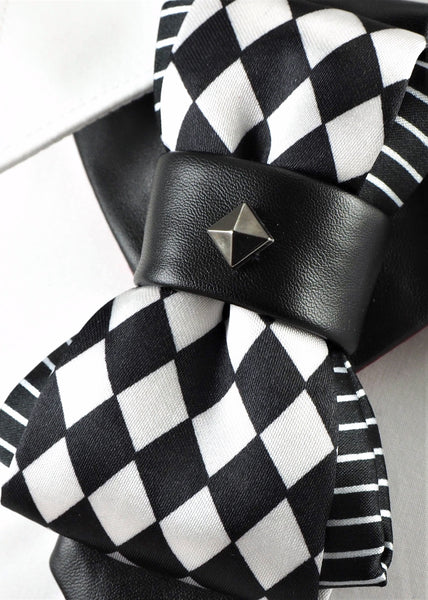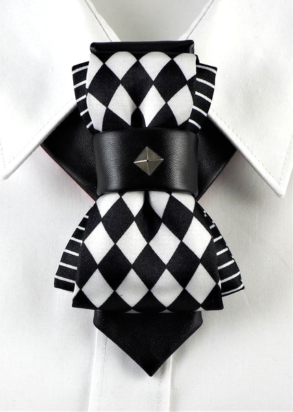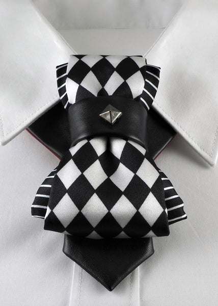 black and white checkerboard necktie, unique design necktie, leather strap necktie, studded detail necktie, luxury necktie, handmade necktie, original design necktie, elegant necktie, stylish necktie, fashion necktie, formal necktie, evening wear necktie, bespoke necktie, patterned necktie, distinctive necktie, statement necktie, modern necktie, premium necktie, sophisticated necktie, high-quality necktie, exquisite necktie, detailed necktie, accessory, men's fashion, neckwear