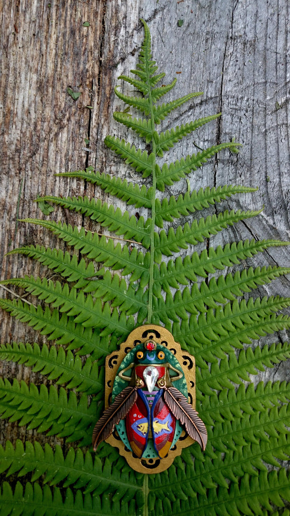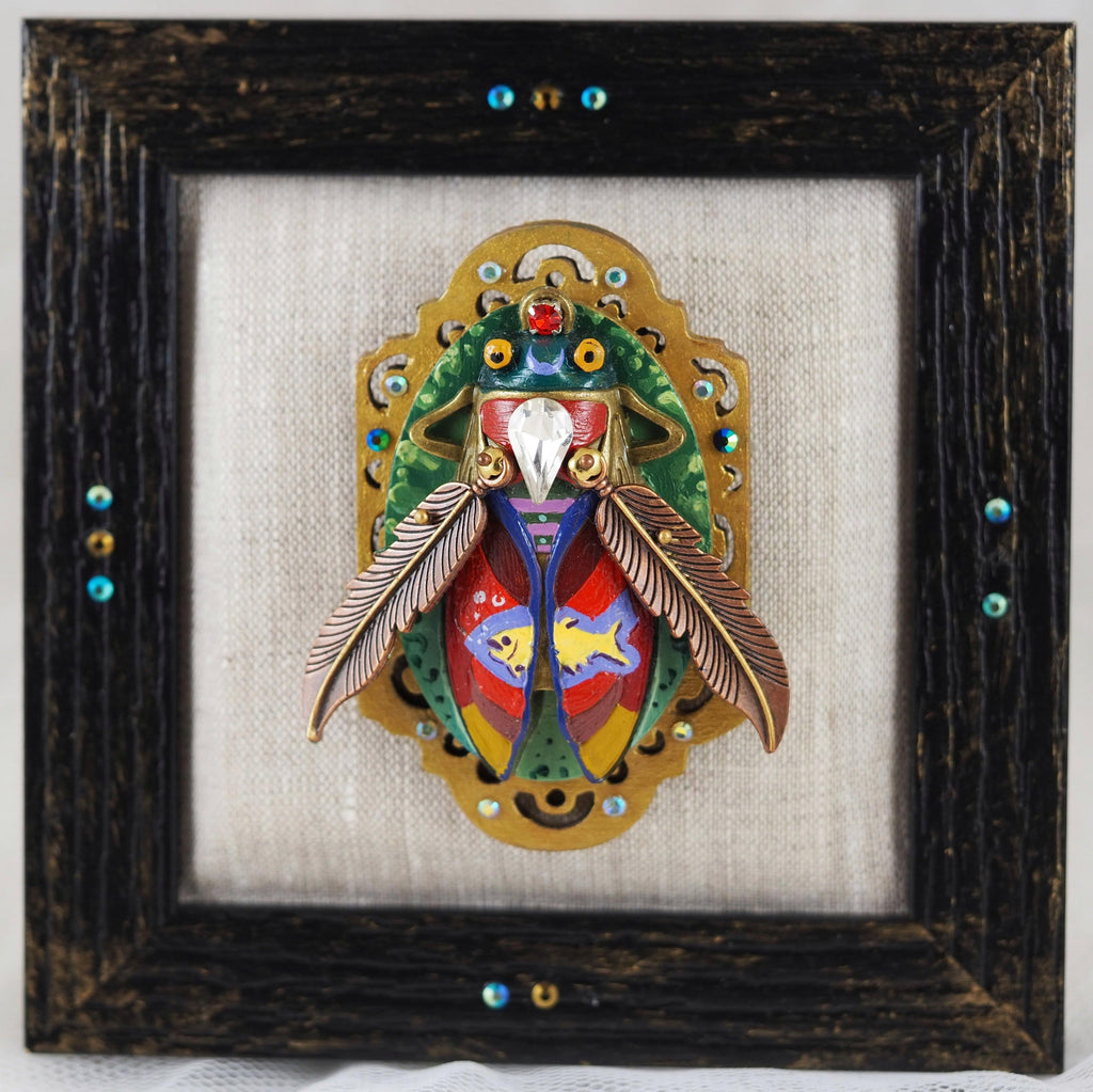 The main element of an accessory is an oval-shaped wooden plate covered with a metal plate. The exterior of the beetle is decorated using classical oil paint technique. The miniature design is enriched by crystals. Covered by sprayed protective polish layer.